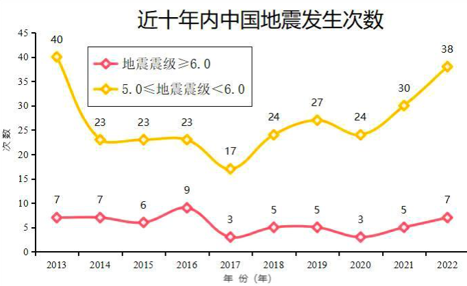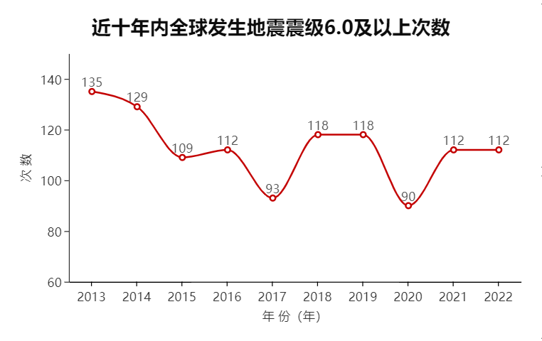 从中国地震台网纪录的数据可以看出,近10年内全球发生6.0级以上地震次数变化不大,平均每年发生112.8次,而且近2年来发生次数都在均值附近,这属于地壳正常运动碰撞产生的现象。同时,我们可以看出我国近10年内每年发生6.0及以上地震次数没有较大差异,地震发生震级在5.0—6.0级之间也属于正常波动,地震确实未变频繁。