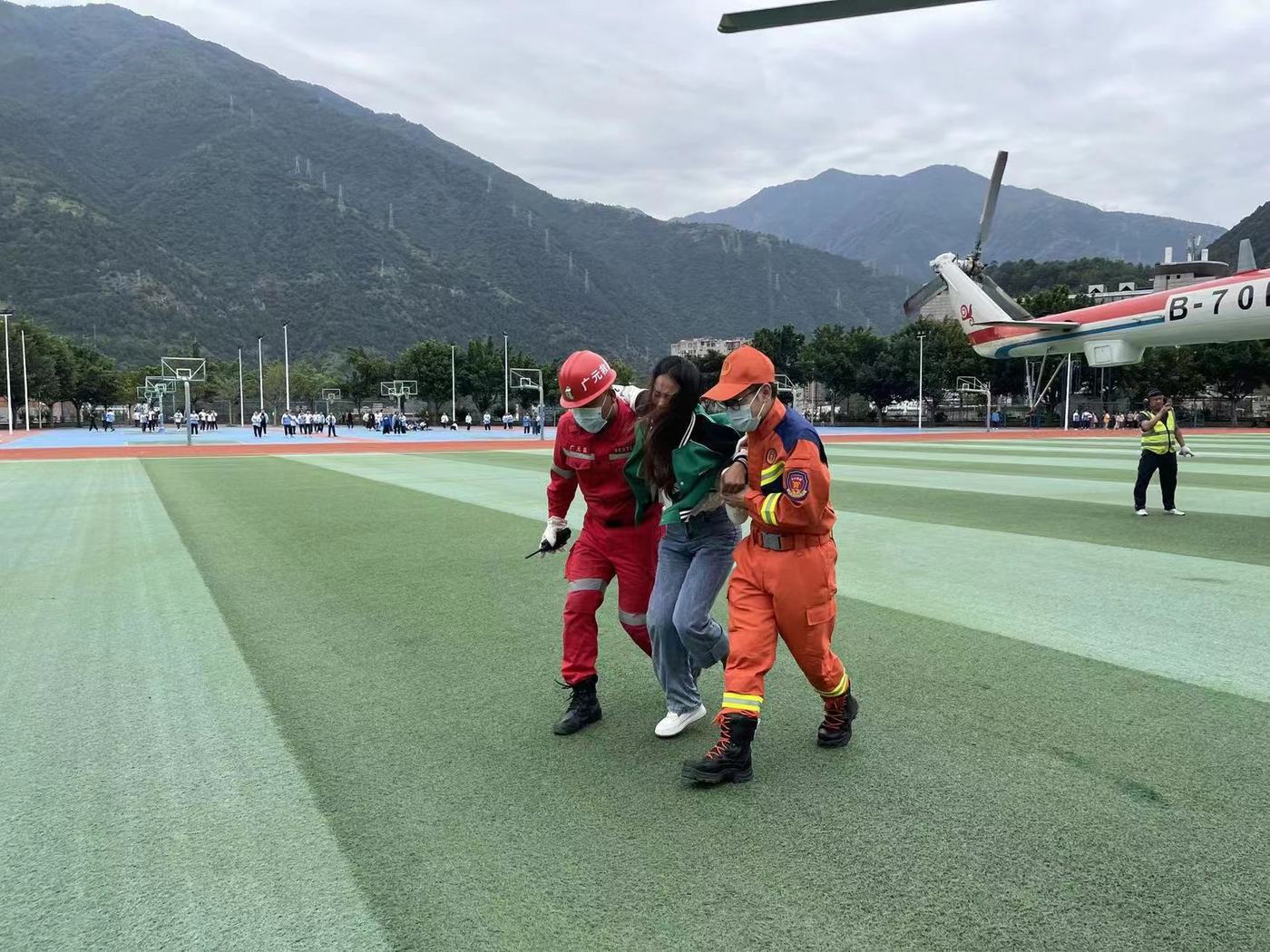 15:40,支队12名参加救援的指战员乘直升机携救援装备和72小时自我保障物资前往距离震源较近的王岗坪乡查看震后情况,并通过卫星电话向前方指挥部汇报现场受灾情况。