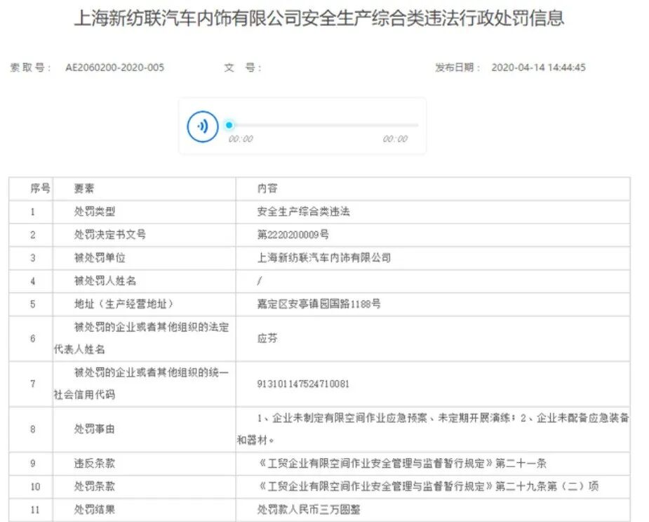 据上海应急管理部网站消息,上海应急管理部近日公布的关于对上海新纺联汽车内饰有限公司(以下简称新纺联)安全生产综合类违法行政处罚信息显示,新纺联存在以下问题:1、企业未制定有限空间作业应急预案、未定期开展演练;2、企业未配备应急装备和器材。
