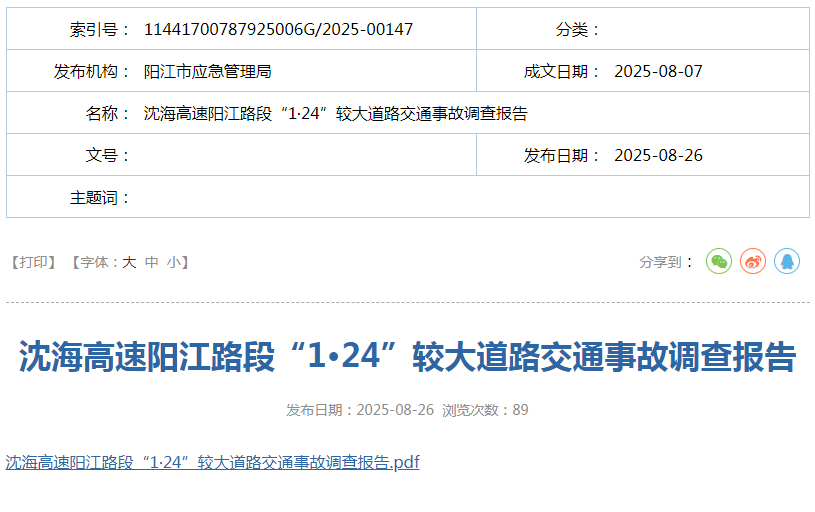 经调查认定,沈海高速阳江路段“1·24”较大道路交通事故是一起因小轿车超速行驶失控碰撞重型半挂牵引车,运输企业安全责任落实不到位,运输企业属地监管部门安全管理不到位导致的较大生产经营性道路交通责任事故。