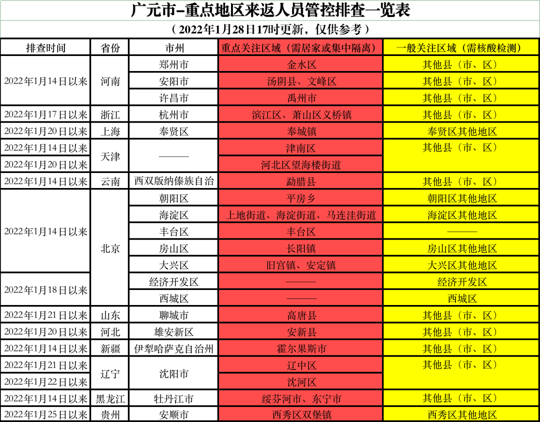 一、请2022年1月14日以来自河南省郑州市、安阳市、许昌市,天津市,云南省西双版纳傣族自治州,北京市朝阳区、海淀区、丰台区、房山区、大兴区,新疆伊犁哈萨克自治州,黑龙江牡丹江市,2022年1月17日以来自浙江省杭州市,2022年1月18日以来自北京市经开区、西城区,2022年1月20日以来上海市奉贤区、河北省雄安新区,2022年1月21日以来自山东省聊城市、辽宁省沈阳市,2022年1月25日自贵州省安顺市来返广人员请做好主动报备。