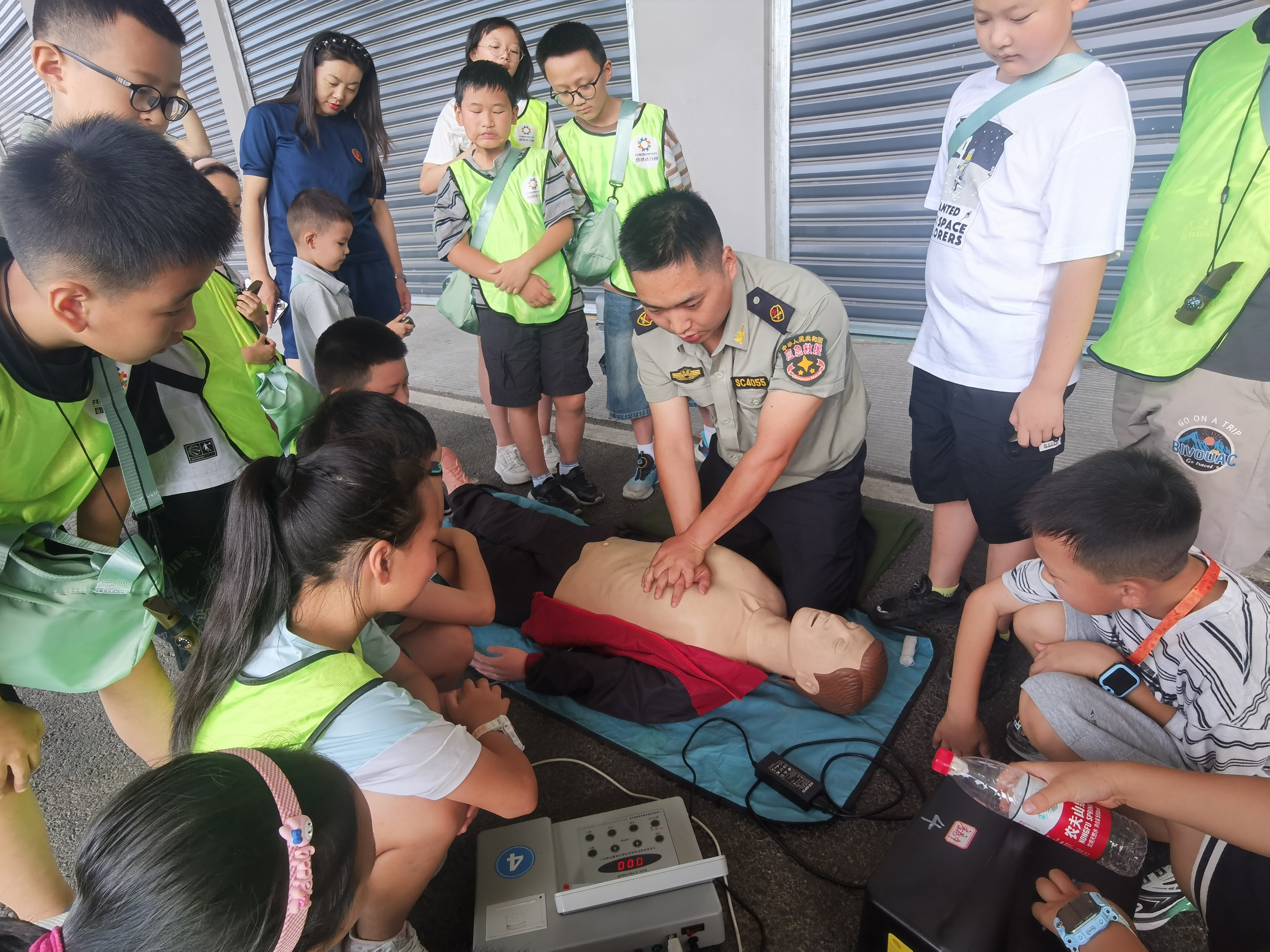 活动现场,市应急救援支队的教官们化身“安全导师”,带来了干货满满的技能课堂。在心肺复苏教学区,教官用通俗易懂的语言拆解操作步骤,从判断意识、清理口腔异物到规范按压、人工呼吸,每一个细节都手把手纠正;在消防器材展示区,干粉、二氧化碳、水基型等不同类型的灭火器依次排开,教官结合真实案例讲解适用场景,还让孩子们轮流上阵实操灭火,“提、拔、握、压”的动作要领在反复练习中深植于心。在室外训练场,大家观看了精彩的无人飞行表演,无人机时而编队穿梭,时而悬停展示,精准的操控引来阵阵欢呼与热烈掌声。