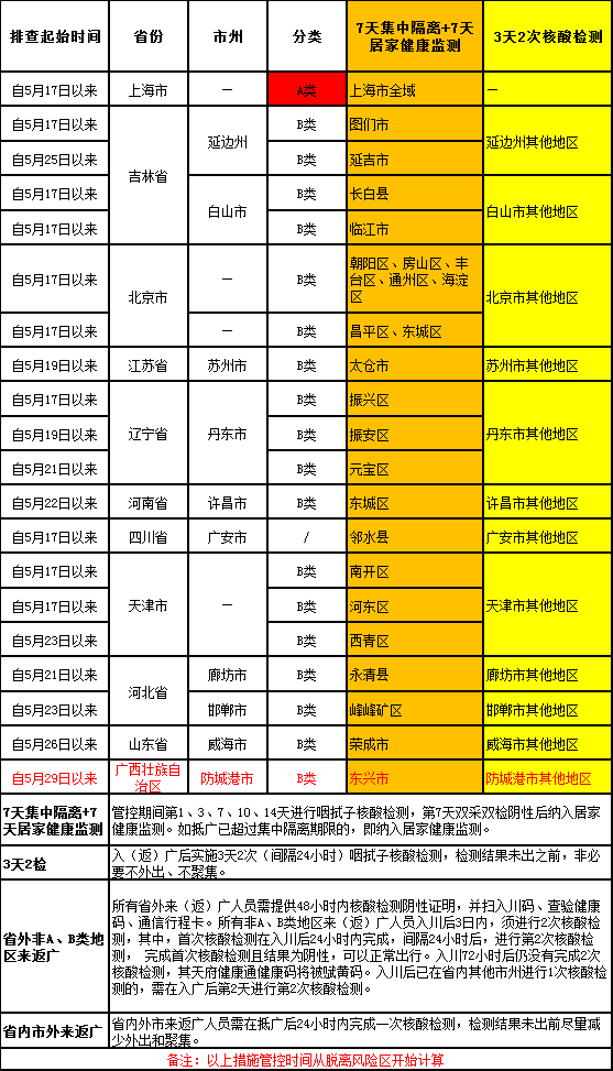 为最大限度减少对人民群众生产生活的影响,分级分类做好健康管理,按照国务院联防联控机制和《四川省新冠肺炎疫情防控工作指南(第五版)》有关要求,结合当前国内疫情形势,现对国内重点地区来返广人员管控措施进行分类梳理,排查管理措施根据各地疫情形势动态调整。