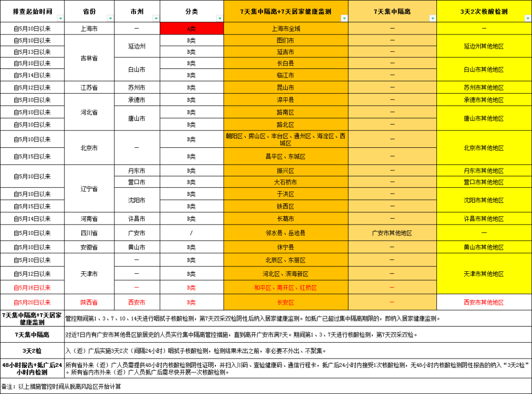 为最大限度减少对人民群众生产生活的影响,分级分类做好健康管理,按照国务院联防联控机制和《四川省新冠肺炎疫情防控工作指南(第五版)》有关要求,结合当前国内疫情形势,现对国内重点地区来返广人员管控措施进行分类梳理,排查管理措施根据各地疫情形势动态调整。