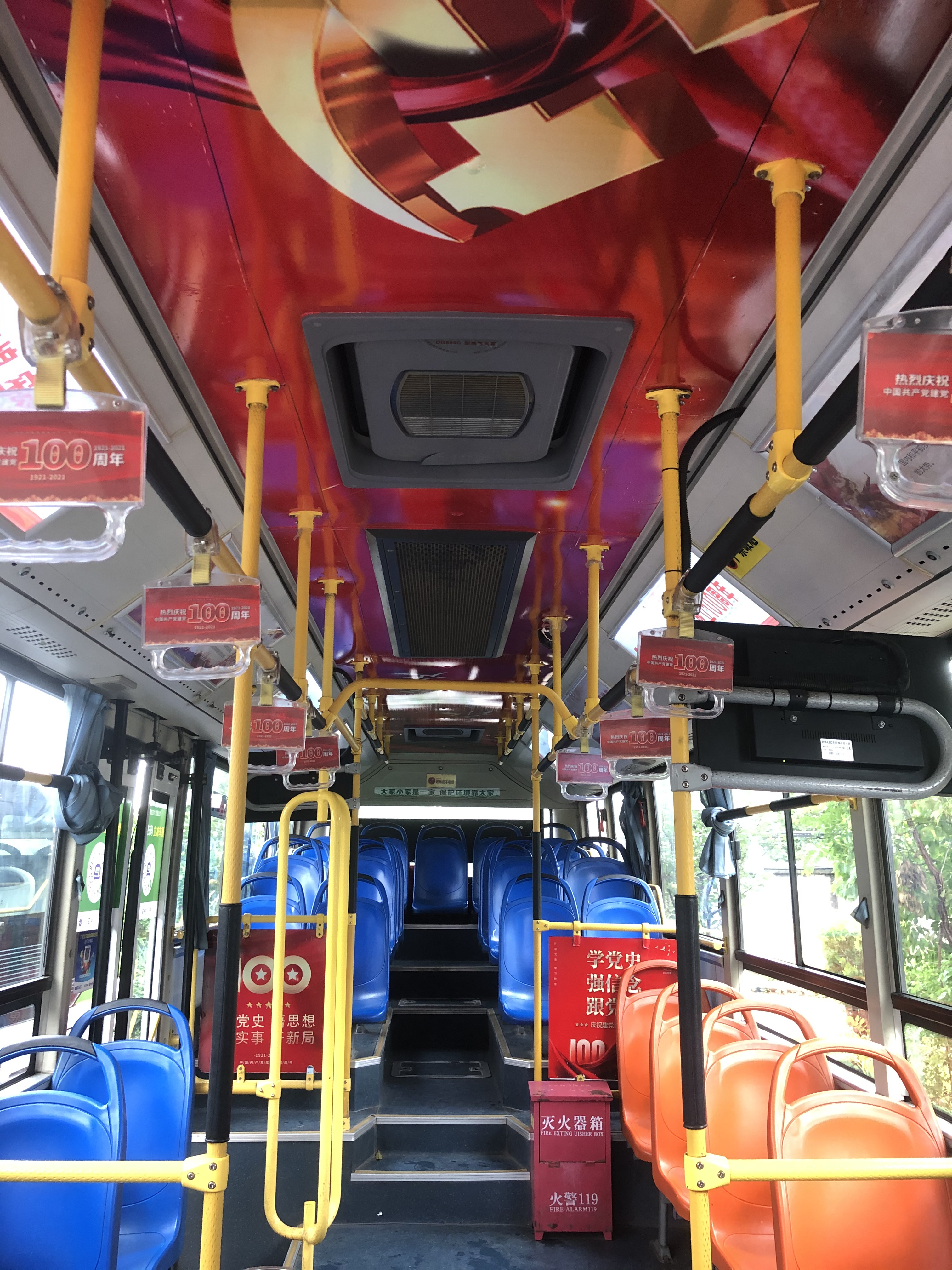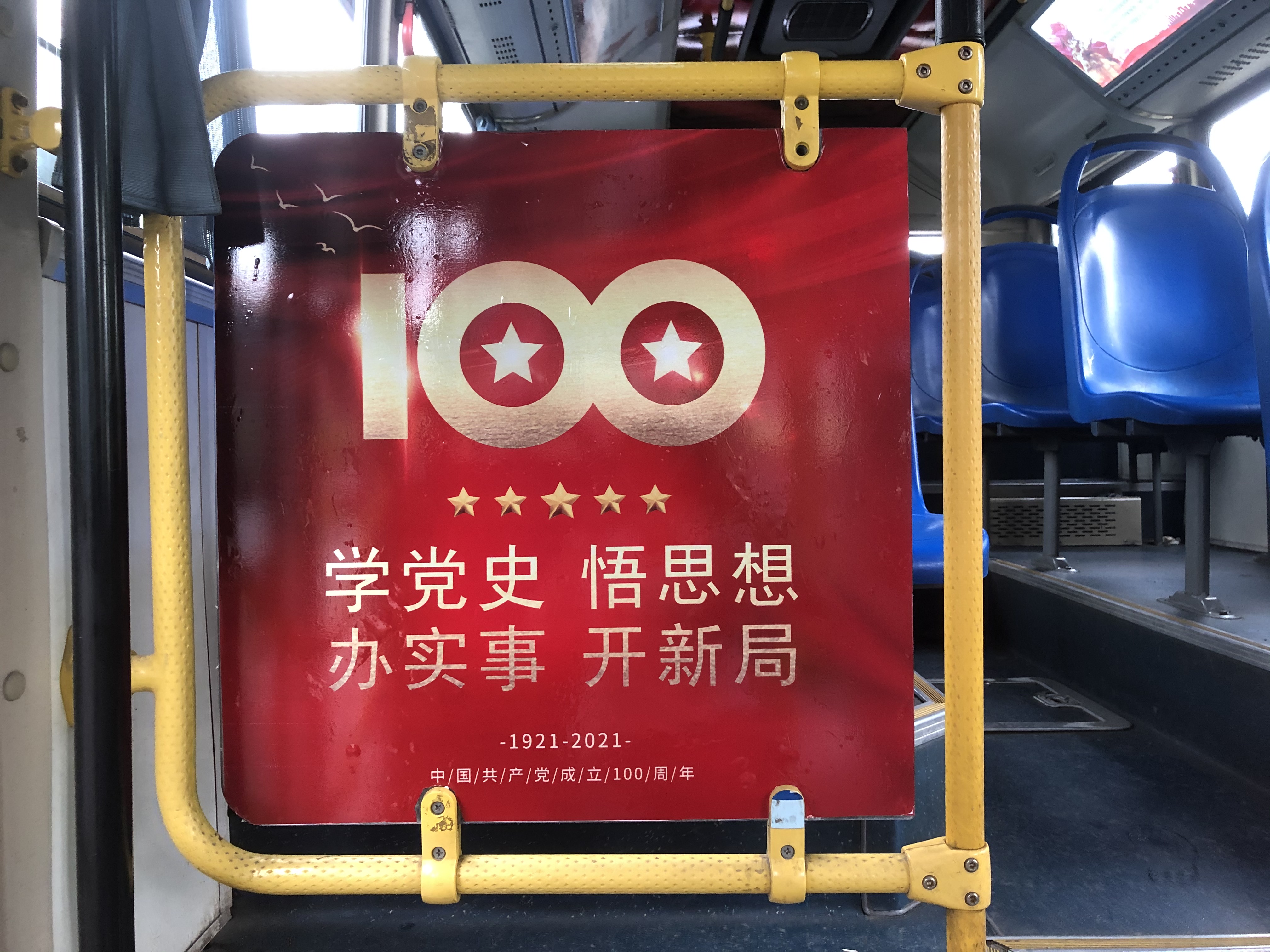 为扎实推进党史学习教育,广泛宣传庆祝中国共产党成立100周年,进一步激发全市党员干部群众爱党爱国爱社会主义的巨大热情,市交旅集团公交公司将17路线两台公交车车厢倾情打造为建党百年红色主题文化车厢,让党史学习知识入驻公交车厢,让建党百年宣传内容在城市流动展现。