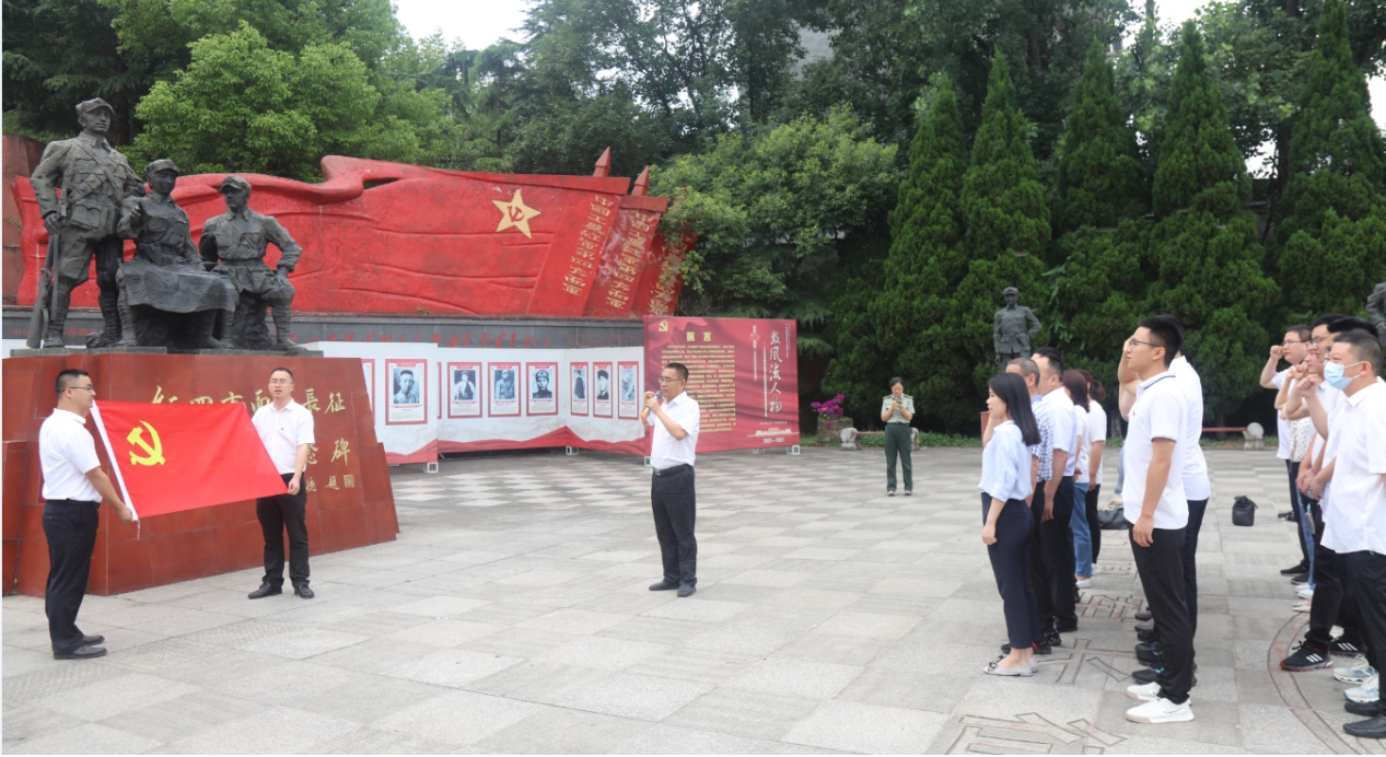 在红四方面军长征出发地纪念碑前,全体党员干部面向鲜红的党旗,右手握拳过肩,重温了入党誓词,进一步坚定了"听党话、感党恩、跟党走"的思想自觉和行动自觉。