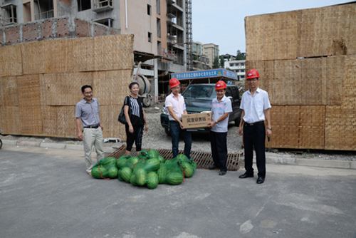 近日,气温节节攀升,市资博集团公司工会主席赵新勇一行,到一线看望和慰问了烈日下依然坚守在项目施工现场的员工和农民工们,为他们送去了藿香正气液、西瓜等防暑降温药品和物品,保障他们的身心健康,让他们在酷热的夏天也能感受到一片清凉。