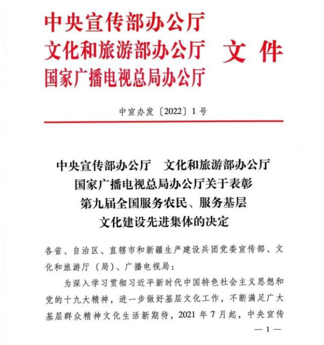 近日,中宣部等三部委联合发文表彰2021年"第九届全国服务农民、服务基层文化建设"先进集体,市文旅集团下属电影公司控股子公司广元市惠民农村数字电影院线有限责任公司喜获全国"基层电影服务先进集体"殊荣。