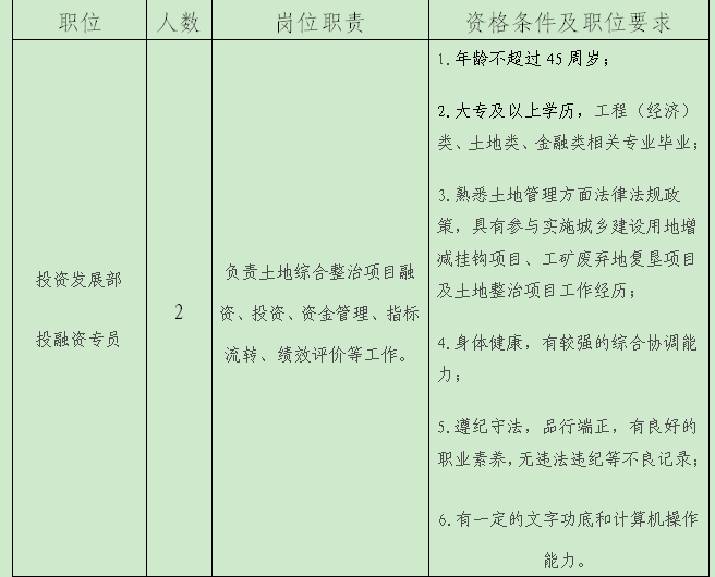 广元国成投资有限公司是广元市人民政府于2015年7月批准成立的具有独立法人资格的国有企业。现根据公司业务需要,面向社会公开招聘投资发展部投融资专员,其岗位职责、报名的资格条件及职位要求如下。