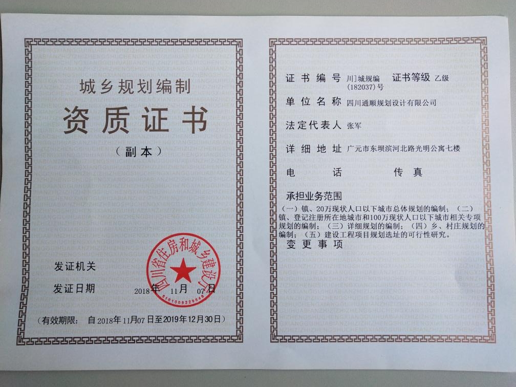 近日,市城建投资集团有限公司全资子公司四川通顺规划设计有限公司经四川省住房和城乡建设厅批准,取得城乡规划编制资质乙级证书,成为我市第一个具有城乡规划编制资质的单位。