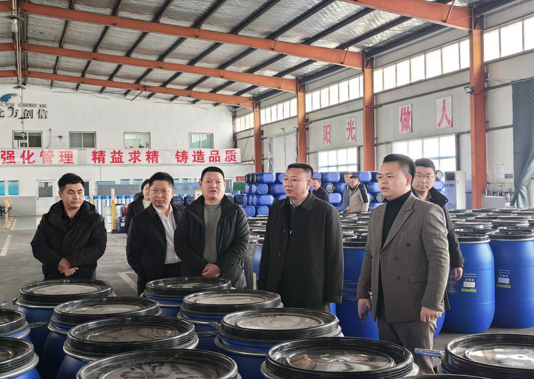 在山东某防水科技集团股份有限公司,杜非一行详细了解了CX-SSE喷涂速凝橡胶沥青涂料产品工艺流程及公司生产经营状况。