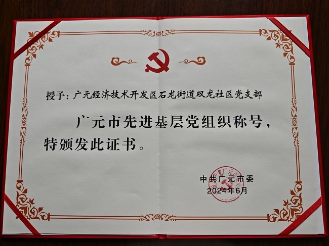 2024年建党103周年之际,双龙社区党支部被评为“广元市先进基层党组织”。双龙社区党支部荣获此殊荣,是一份鼓励,也是一份责任,荣誉牌下,党员干部将继续以实际行动践行初心使命,发挥好基层党组织的战斗堡垒作用,推动各项工作再上新台阶。