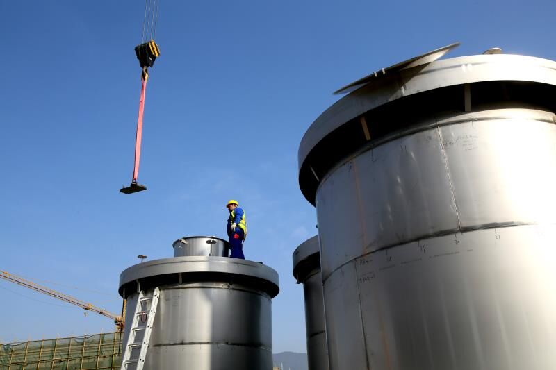 11时30分,在劳特巴赫(广元)啤酒有限公司啤酒发酵罐制作工区,10余个高18米、直径4米的大圆罐成排矗立,蔚为壮观。旁边,20吨吊车吊着正在制作的罐体逐渐增高,罐体下,中集集团(南通)集装箱安装公司的工人们正在有序进行焊接。