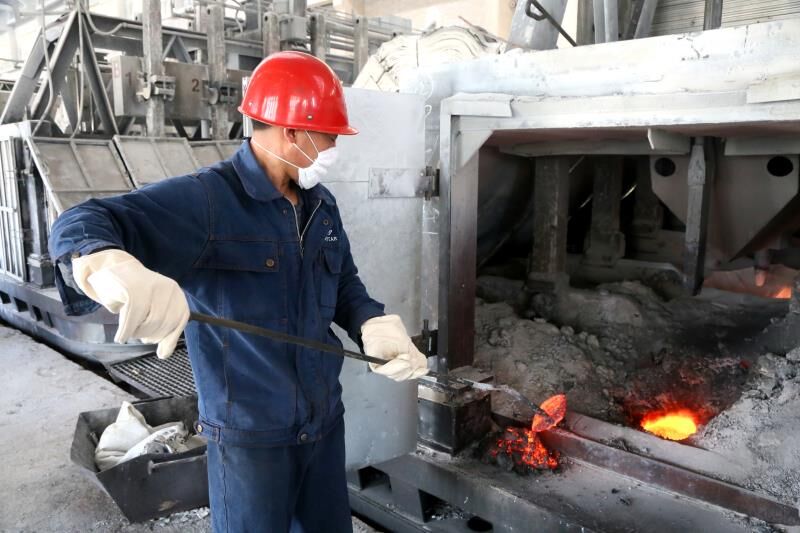 16时20分,快下班了,40岁的李奇钟还要检查一下电解槽的运行情况,打开炉门,炙热的气浪冲了出来,他拿起探渣勺,伸进红红的铝水中,“要检查炭渣多不多,下料是否正常,火苗是否正常。”
