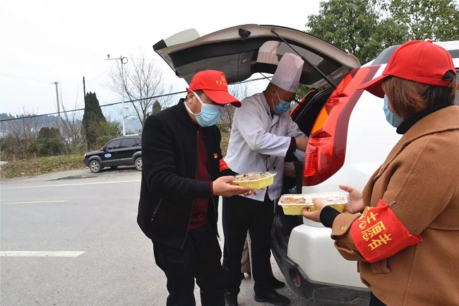 “先莫忙咯,快来吃晌午咯”,“余老板,把你辛苦了”,“我辛苦啥子嘛,你们天天白日黑夜的,才是真的辛苦哦”,2月7日中午,盘龙镇“三大盆”农家乐业主余中弟来到了盘龙镇深沟村疫情防控检测点,为该检测点一线值守人员送上了今日份的“爱心盒饭”,在确保每一位值守人员都吃上午饭后,他又匆匆忙忙的赶往下一个检测点。 春节期间,本来应该是营业“旺季”的农家乐,因为疫情来袭,不得不关门歇业。农家乐虽然歇业,可余中弟却没有闲着,在耳闻目睹全镇干群众志成城、万众一心的抗击疫情后,他也想汇入这股“战疫”的洪流,毅然决定为一线值守人员免费供应午餐。为确保大家吃饱、吃好,从食材采购、饭菜烹饪到餐具消毒都坚持亲自采购、亲自下厨、亲自把关。