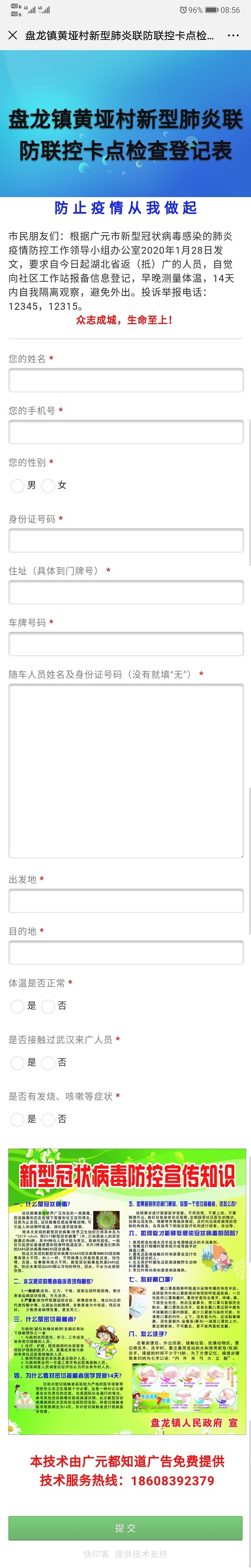 针对这一问题,盘龙镇积极联系到赞助公司,免费制作了二维码网上登记系统,流入人员只需利用微信扫一扫功能,在弹出的页面上填写姓名、车牌号、身份证号码、联系电话、出发地、目的地等信息,尤其是家庭地址和流出、流入地址都是键盘点选,精确到村社,操作简单,一次直接录成电子版,而且IP地址、过往时间非常精准,便于追踪查证。镇村干部用账号密码在手机端登录,随时随地也可查询监测点的登记情况。