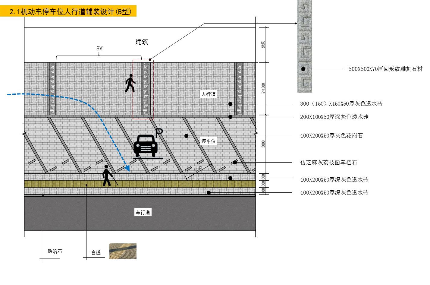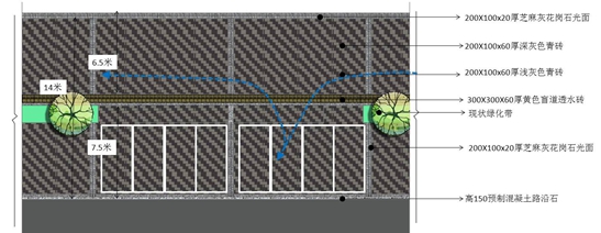 (二)泰山路人行道改造:总长约1935米,周边以学校区域为主,其人行道主要以树池分割。现状道路宽度较统一,其宽度5米左右。该路段断路在改造中要注意规范划分路面停车区域,其次新建道路的花岗石与老路的衔接。