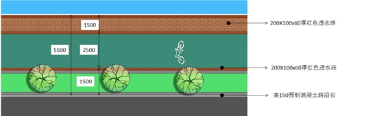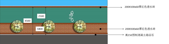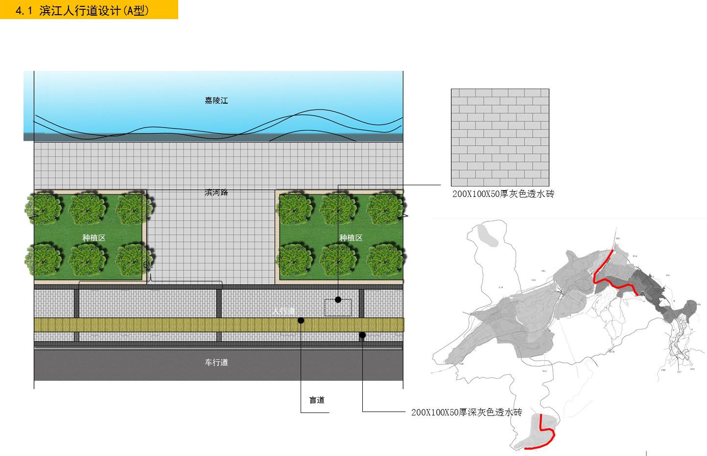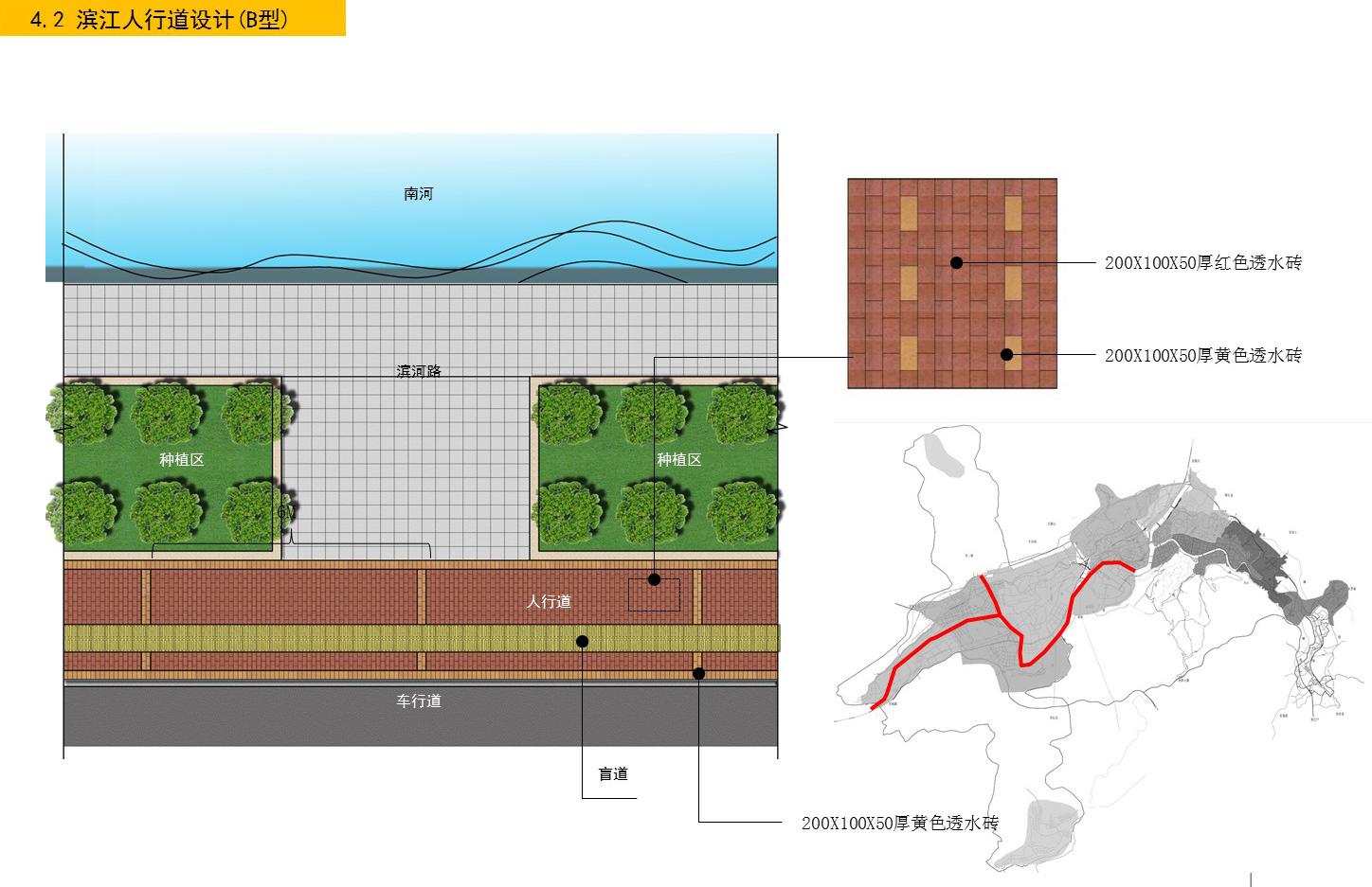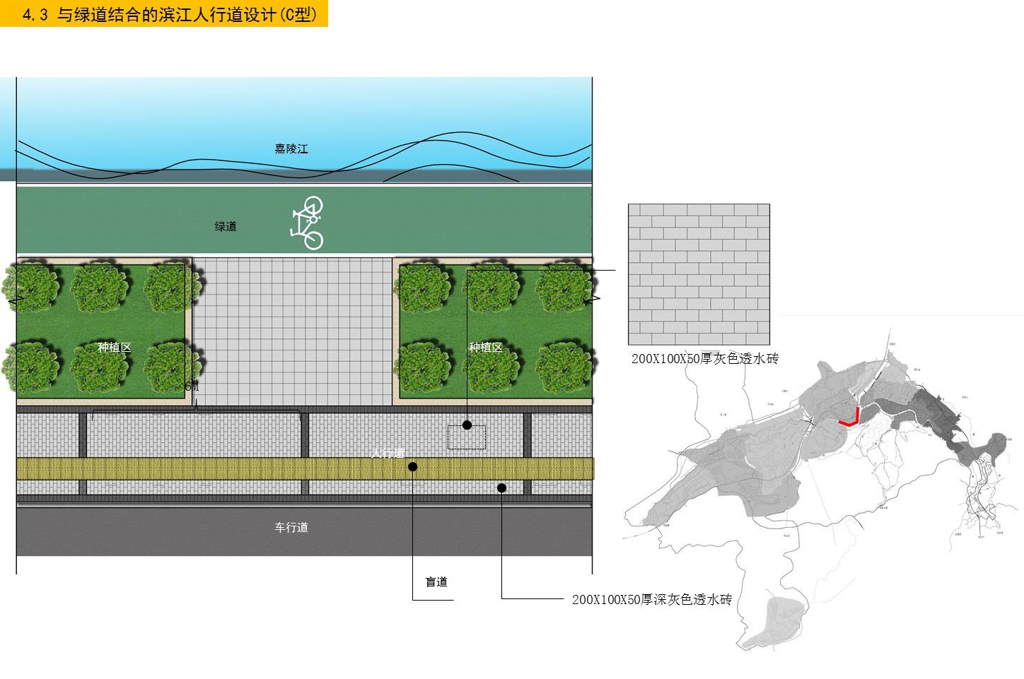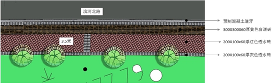 (十)滨河绿道人行道改造:滨河绿道段道路,主要设计到原有人行道与绿道结合的问题,绿道已经形成,人行道路面宽度不一。绿化主要以带状绿化和种植池为主。