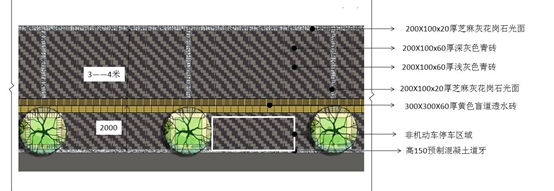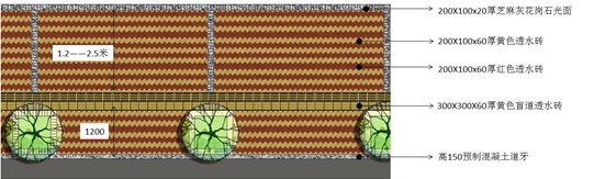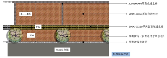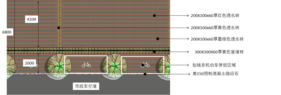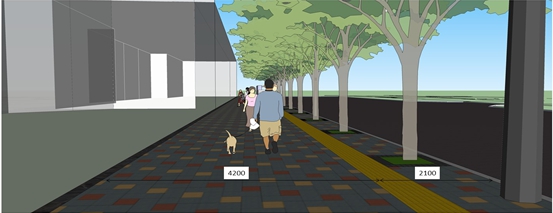 (九)澳援大桥至一机厂人行道改造:总长约1121米,人行道主要靠市政绿化带,少建筑。所以人行道路面不考虑停车区。起宽度2.5米——4米,绿化主要是树池形式。