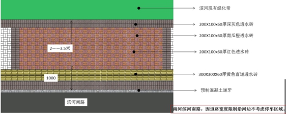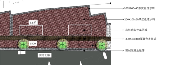 (三)滨河北路人行道改造:全长约5110米,改路段沿河边的人行道宽度较统一约3米左右,主要以树池分割;道路另一边主要是商业门面,,宽度约5到7米不等,局部可考虑平行停车。