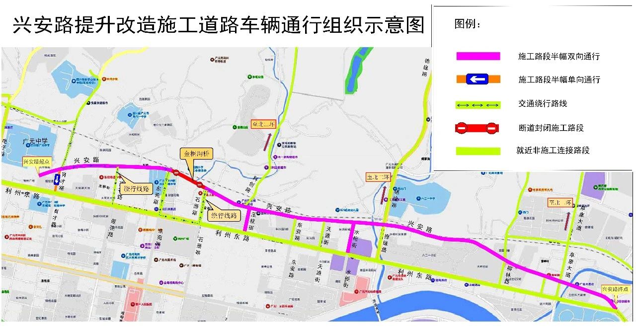 利州区兴安路及其育才路、玉桂街、水柜街连接段将实施提升改造施工,为保障道路交通安全畅通和施工顺利,依照道路交通安全管理法规,现将有关道路施工交通组织管理事项通告如下:一、通行组织管理。兴安路金柜沟桥梁段全封闭施工,车辆从石器路、利州东路、东苑路绕行,其它路段半幅封闭施工半幅车辆双向通行。兴安路育才路连接段第一阶段施工,道路半幅封闭半幅车辆单向通行,禁行方向车辆从兴安路、莲花路绕行;兴安路育才路连接段第二阶段施工与兴安路玉桂街、水柜路连接段施工,道路半幅封闭施工半幅车辆双向通行。施工封闭区,行人须从设置的行人通道通行。除施工绕行路段,其它施工道路公交线路不变,公交站点将根据施工情况临时调整。施工区市民出行,请尽量选择公交、非机动车、步行等方式;非必须进入施工区的车辆,请选择其它道路通行。
