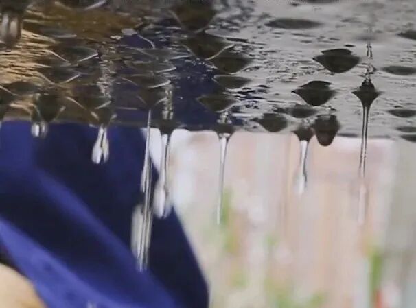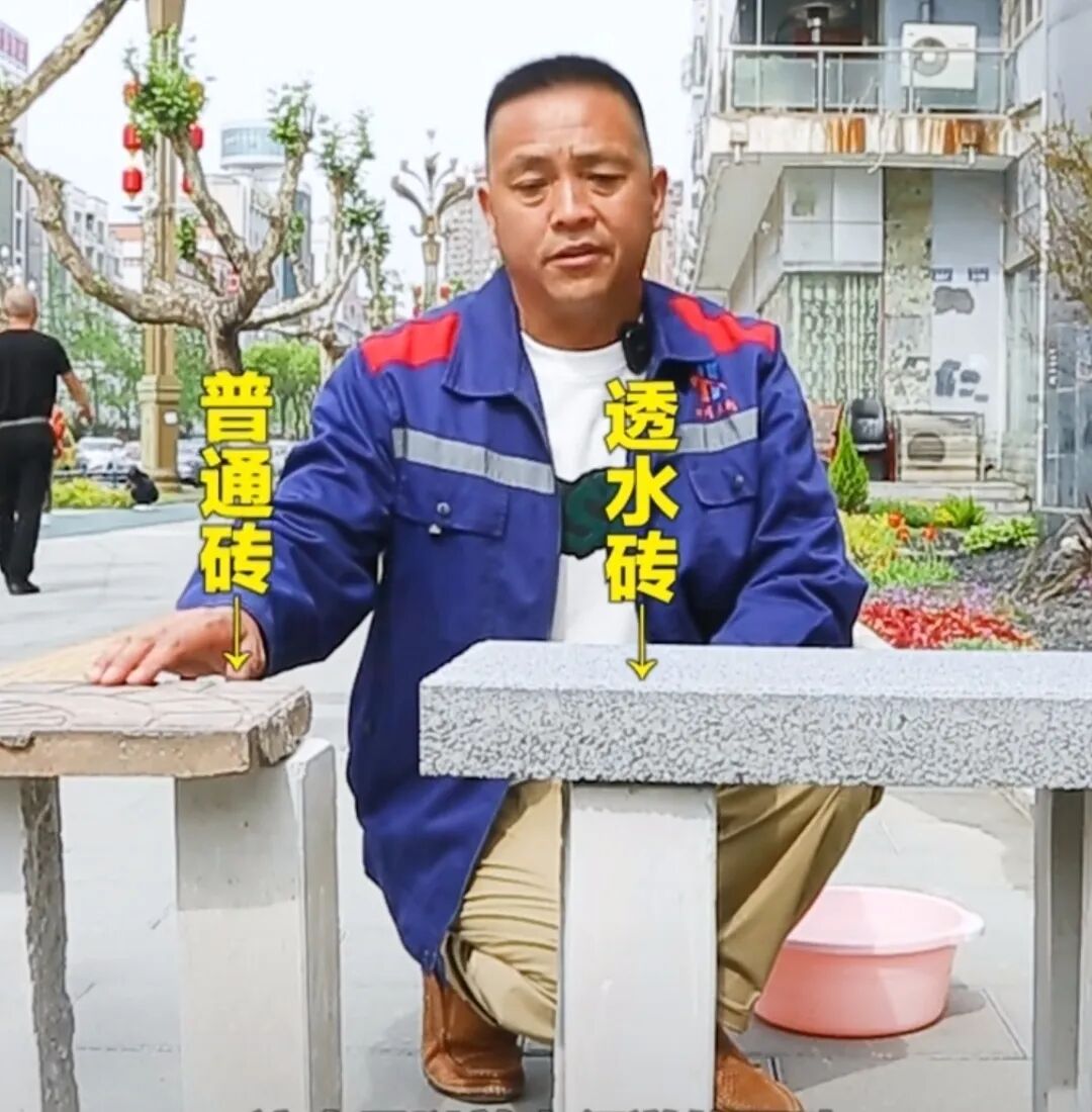 对比实验现场,四川天鸿建设有限公司项目执行经理李仕成将一块透水砖和一块釉面彩砖平行架空摆放,然后用盆先后向两张砖面倒水。3-5秒后,透水砖开始渗水,其下方开始滴落明显水滴,而一旁的釉面砖仅是砖面被打湿,下方未有水滴滴出。