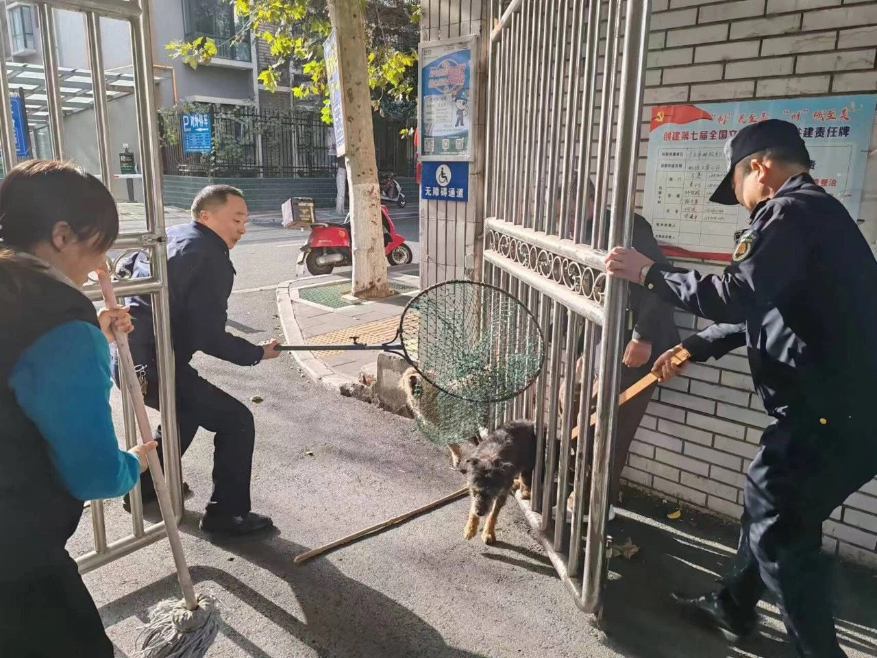 “注意,不要让另外一只流浪狗从大门缝隙溜出去了。”15日下午,在广元市利州区上西街道邮政小区,两名身着制服的城管执法人员正手持捕狗工具,在小区业主的帮助下对数条流浪犬进行捕捉。