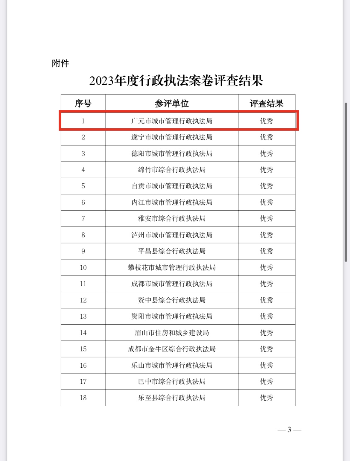 2023年下半年,省住建厅组织全省住建(城管)系统开展2023年度行政执法案卷评查,市城管执法局选送的参评案卷被评为优秀案卷,被省住建厅通报表扬,并以满分的成绩位列全省住建(城管)系统第一名。