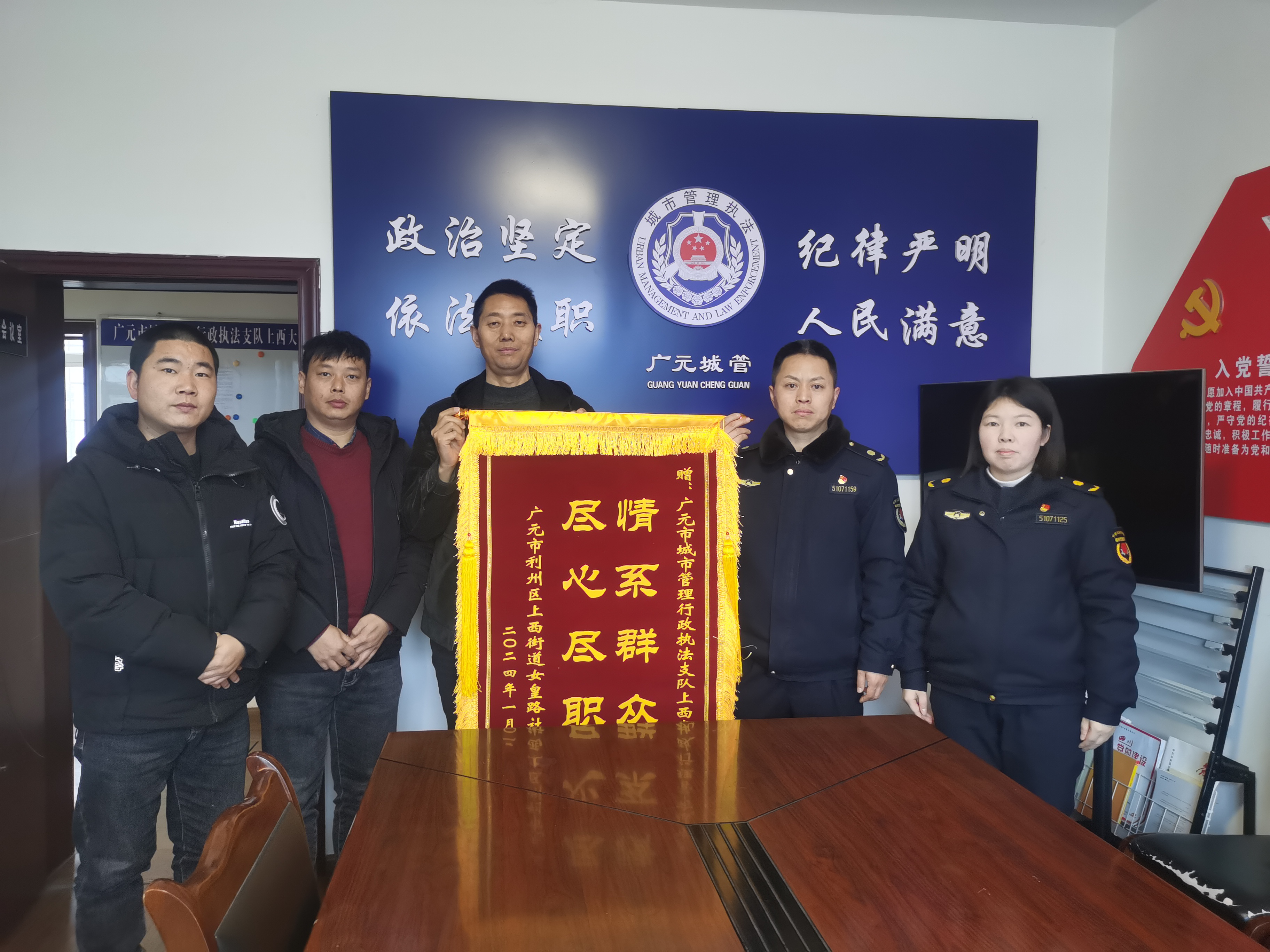 2024年1月15日,上西街道办事处女皇路社区向城管上西大队送来印有“情系群众,尽心尽职”字样的锦旗,对大队践行为人民服务宗旨,与社区共联共建,尽心尽职办实事表达诚挚谢意。