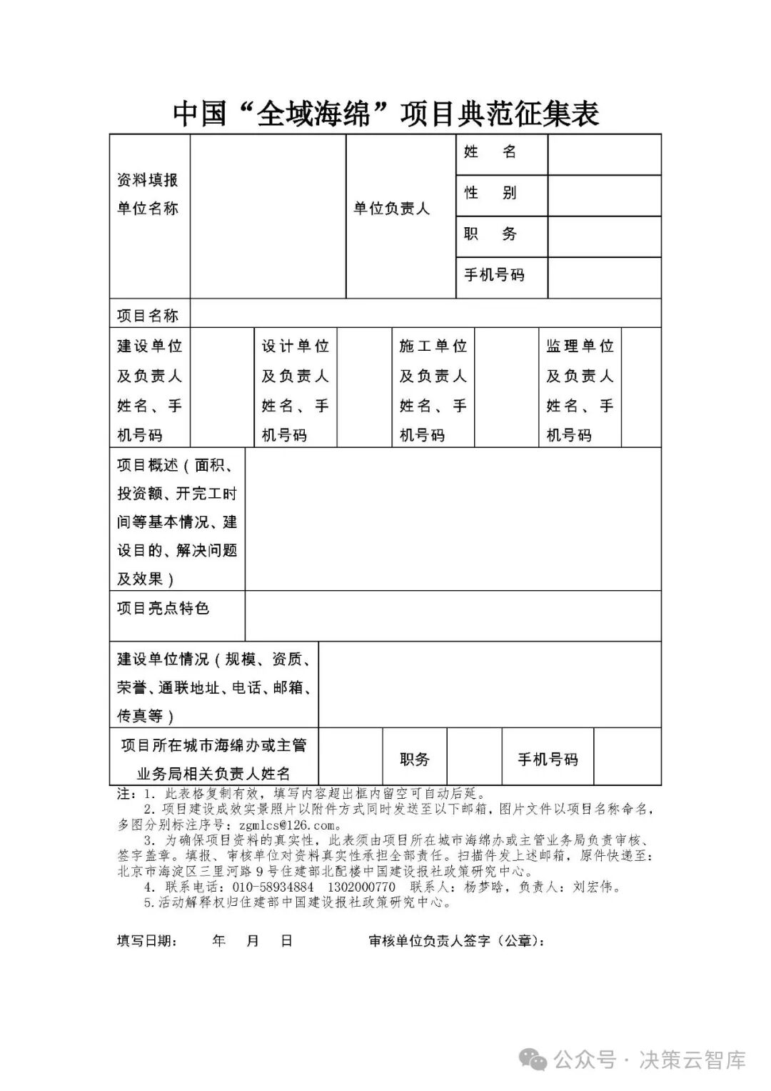 2.为确保推荐典范项目征集表填写资料详实准确,项目登记表由项目所在城市海绵办或主管业务局负责审核、签字盖章。填报、审核单位对资料真实性承担全部责任。