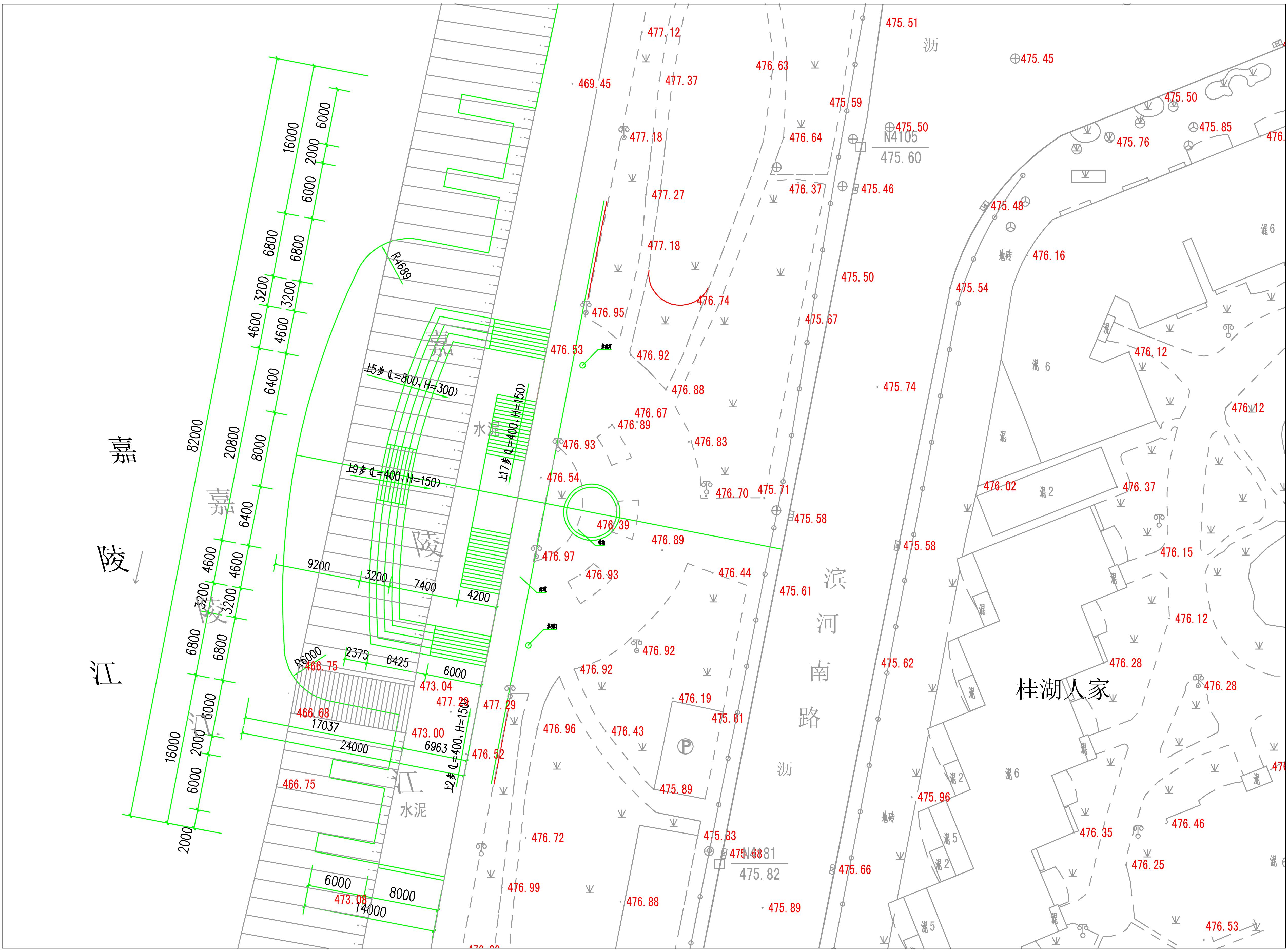利用原地形地貌的高差、亲水与对景的优势,进行梳理。采取直线与弧线结合构图,打造集休闲、观景和码头等功能为一体的简洁大气的景观广场。通过浮雕形式注入广元特色文化。