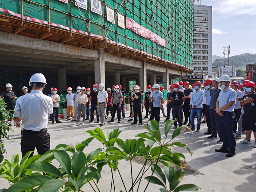 会后,各参会人员到项目施工现场进行观摩交流,项目施工单位介绍了质量安全保证体系、安全防护措施、质量验收管控流程、双重预防机制及清单制管理工作的开展情况。