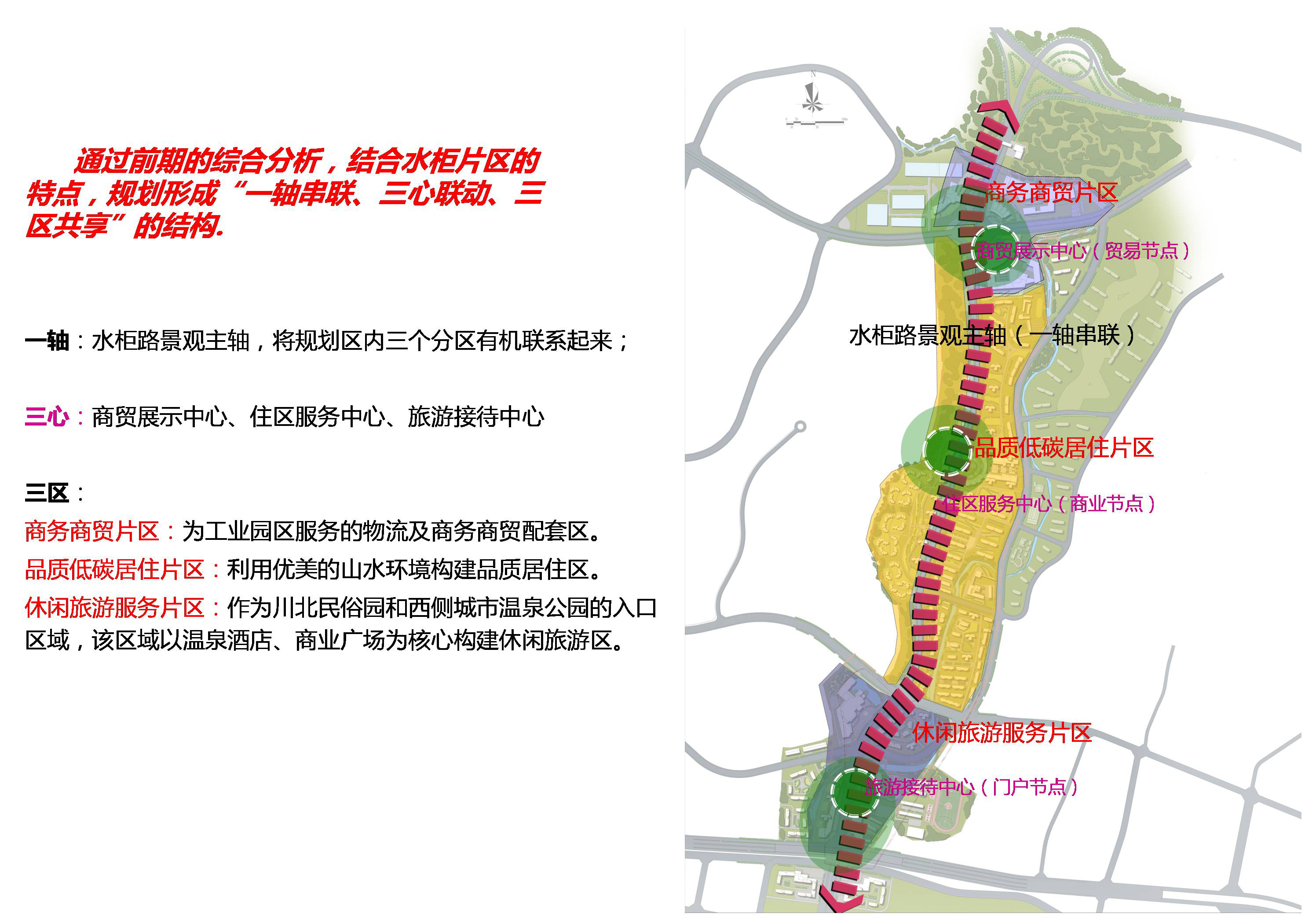 一轴:水柜路景观主轴,将规划区内三个分区有机联系起来;