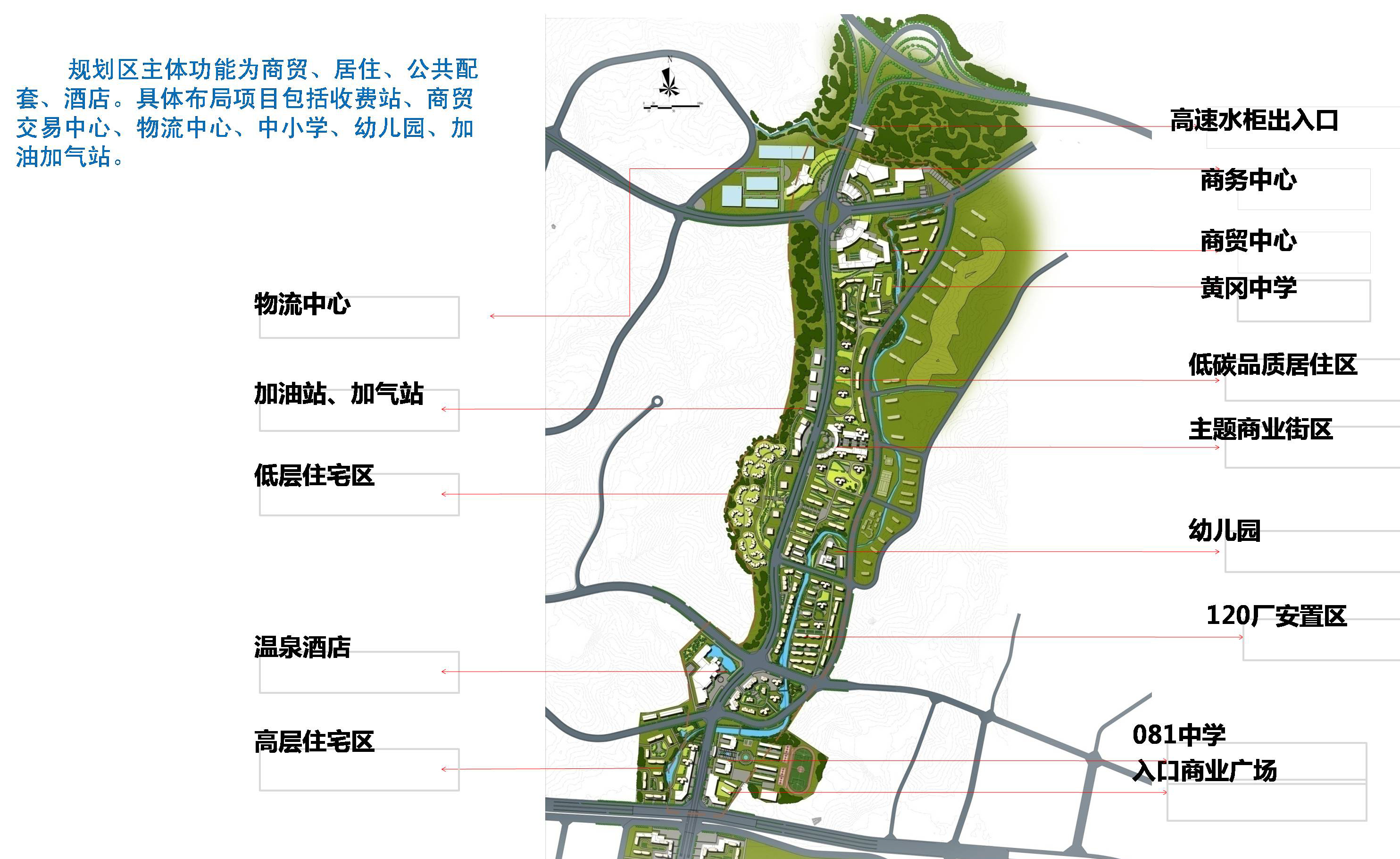 规划区主体功能为商贸、居住、公共配套、酒店。具体布局项目包括收费站、商贸交易中心、物流中心、中小学、幼儿园、加油加气站。