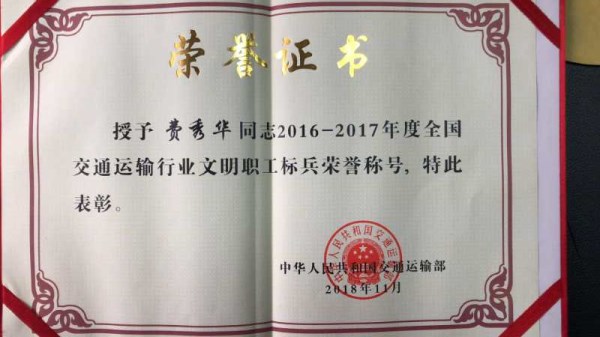 2018年11月,广元市朝天区交通运输局党组成员、朝天区公路养护段段长费秀华被国家交通运输部授予2016-2017年度全国交通运输行业文明职工标兵荣誉称号。