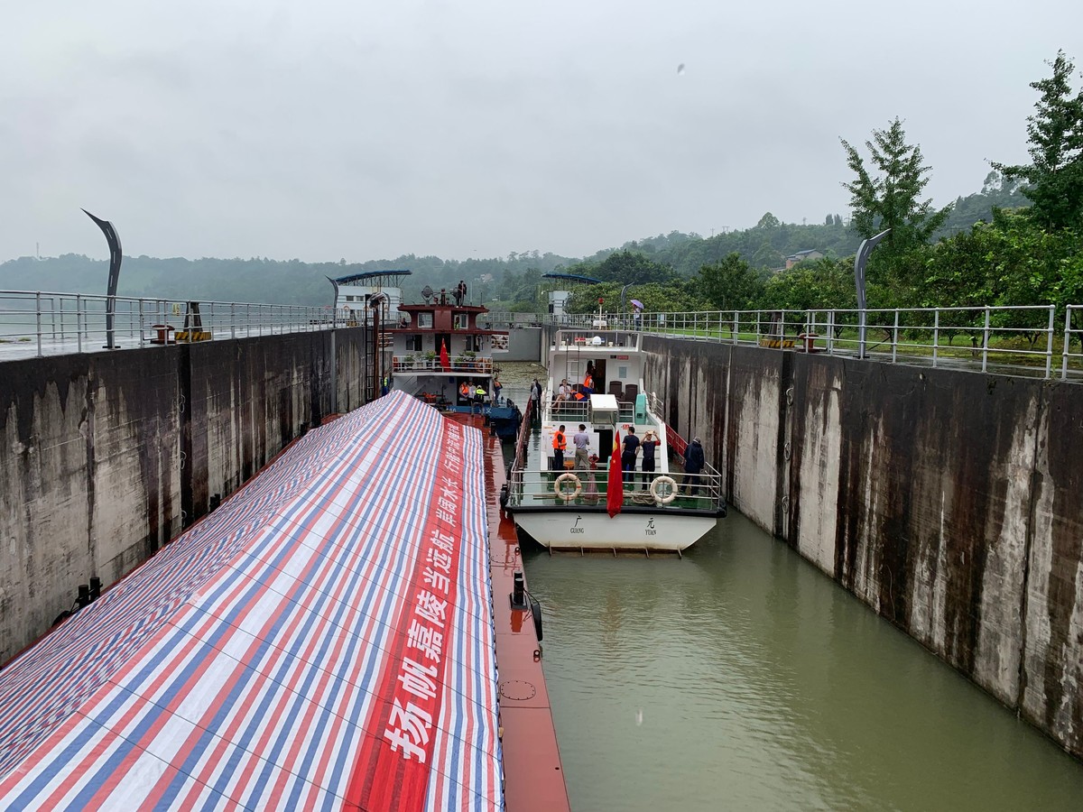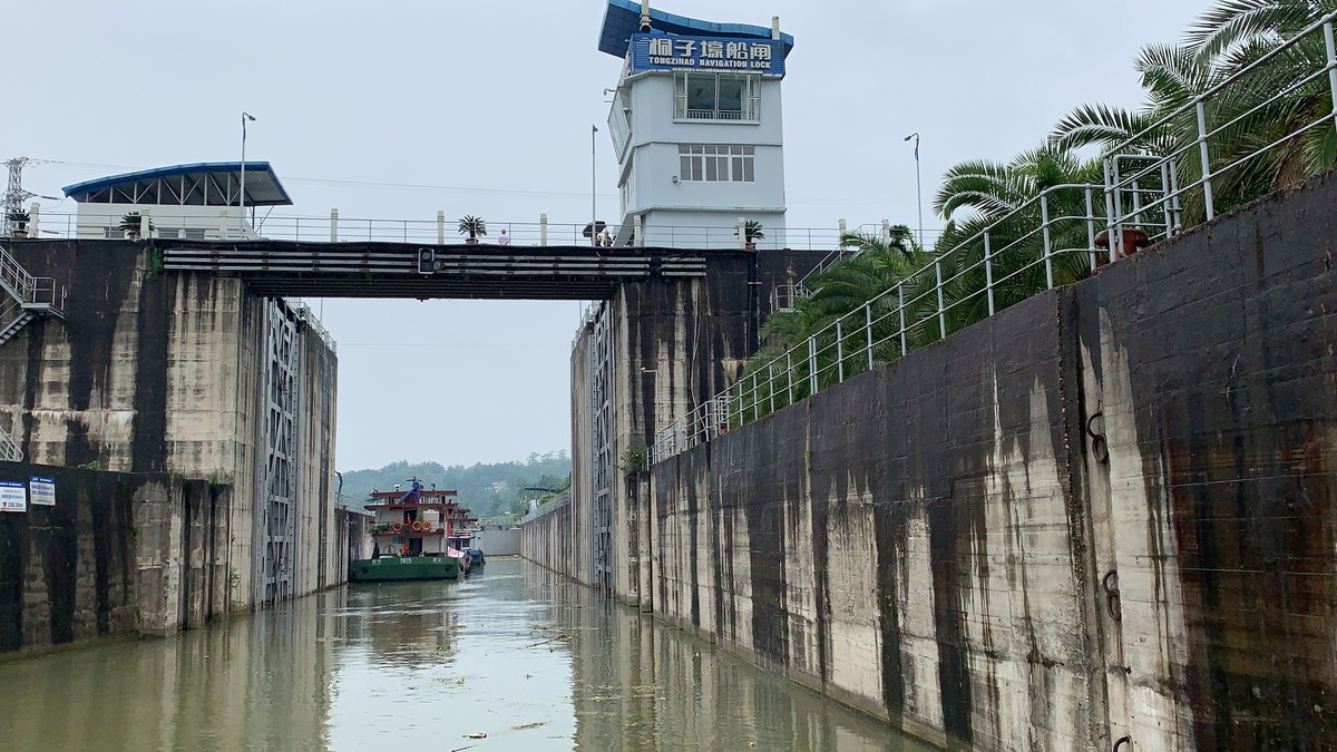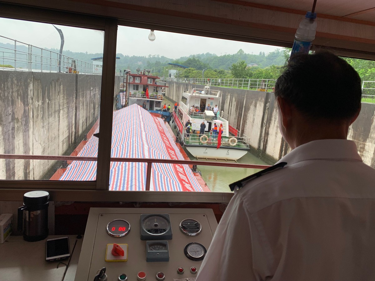 通过闸口,前方的视野一下开阔起来。再往下游行驶约50公里,嘉陵江就将汇入长江,货船预计于明日抵达重庆果园港,随船货物将转乘海船,经长江到江苏张家港,最终到达辽宁营口。嘉陵江全江渠化30年后,第一次有货物从航道源头的广元,驶向长江、通江达海!