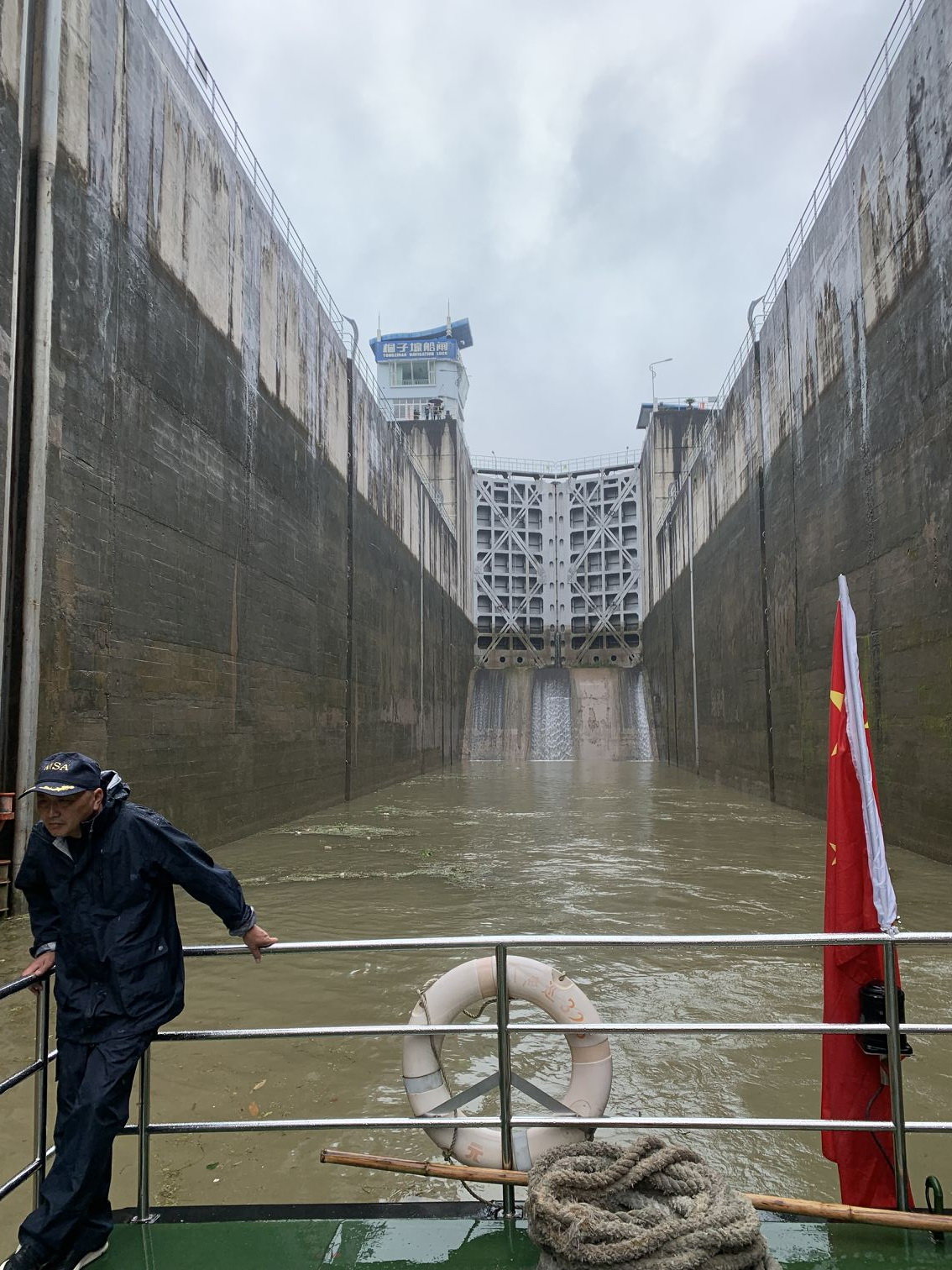 渐渐地,船闸两壁常蓄水的水位线露出来了,而且越来越高,这意味着,水位在下降。20多分钟后,水位线就下降了15米左右。下游闸门开了!货船率先驶出船闸,随后是海巡船。