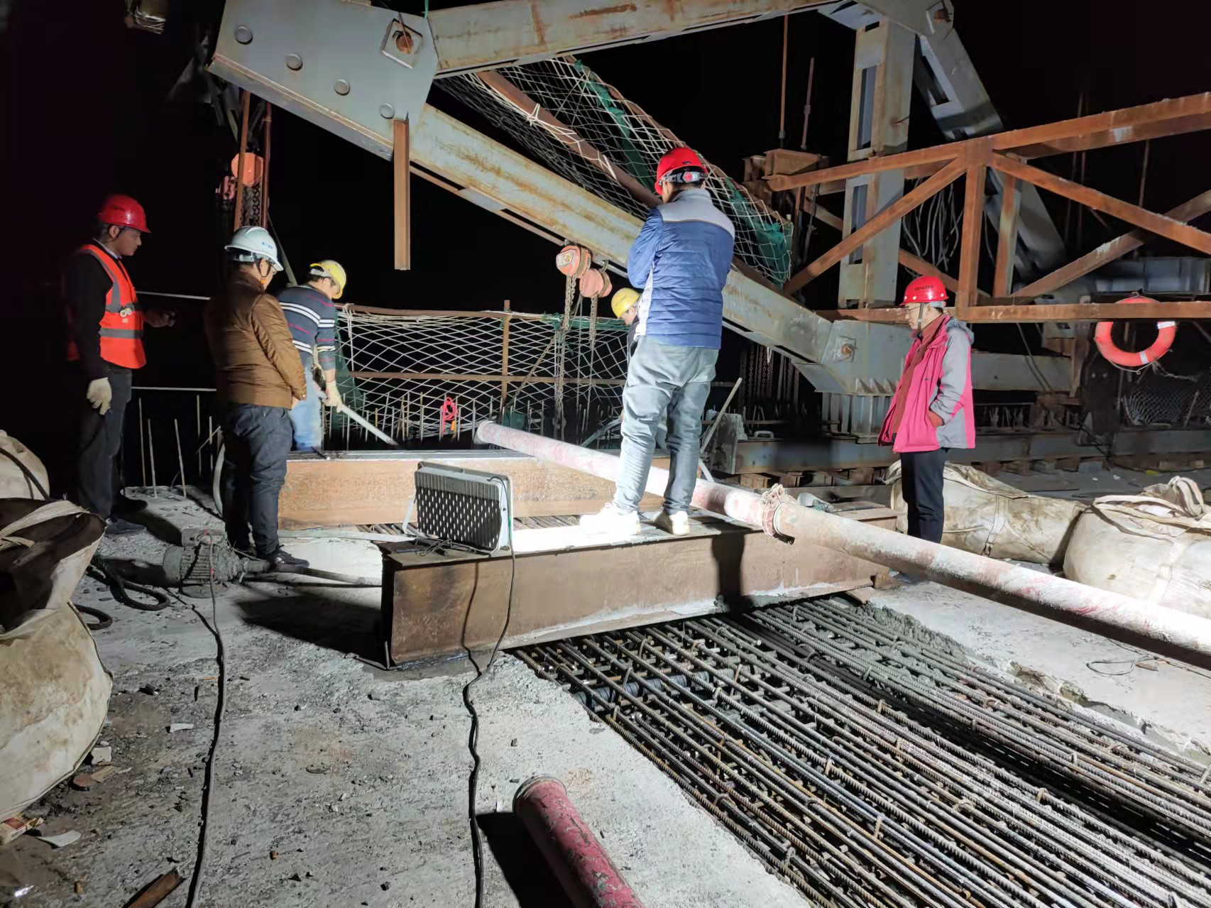 射箭河大桥为该公司广元环湖路项目的控制性工程,位于标头K0+865、射箭河与嘉陵江交汇处,横跨射箭河,全长275米,桥面宽度为18.8米,大桥采用(22.5+30+22.5)m现浇箱梁”+(55+80+55)m预应力钢筋混凝土变高连续箱梁”的桥梁型式。悬浇节段采用挂篮方式施工,边跨现浇直线段采用钢管柱、贝雷梁加盘扣式支架施工,合拢段采用吊架施工。大桥中跨合拢段混凝土方量63.4立方米,合拢段现浇箱梁作业面狭小且属于高空作业,为确保连续梁按期合拢,广元环湖路项目全过程监控连续梁施工,优化施工方案,提升施工工艺,保证工程质量。本次施工经过近5小时的连续奋战,顺利完成混凝土浇筑工作。