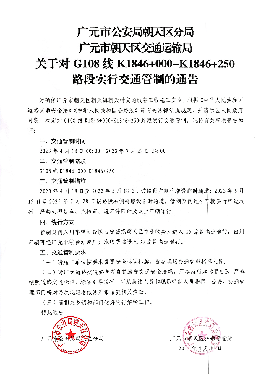关于对G108线K1846+000-K1846+250路段实行交通管制的通知
