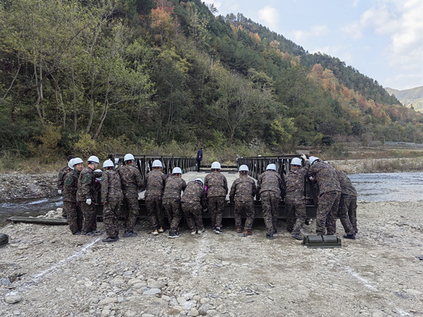演练背景设定为因受强降雨影响,S205线广元市朝天区境内K15+700米处,有一座长约20米的桥梁垮塌,车辆无法通行,亟需架设便桥。在演练现场,随着指挥长的一声指令,钢桥架设演练队伍身着迷彩工装,迅速集结并有序奔赴各自的工位,在高效配合中,队员们齐心协力完成了跨径测量、滚轴安装、鼻梁拼装、主桥拼装等装配步骤,并采用“悬臂推出法”将钢桥整体推出至预定位置,在机械设备辅助下,321装配式公路钢桥完成架设,此处灾毁点也顺利恢复公路通行。随着车辆依次从钢架桥上通过,标志着本次演练圆满成功。