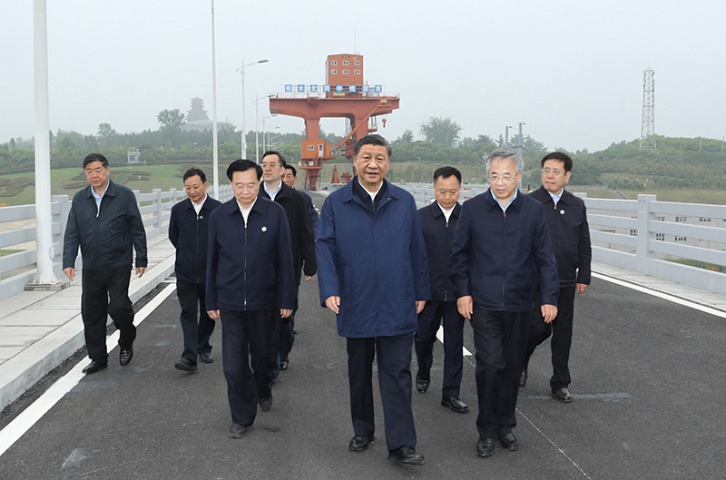 5月14日上午,中共中央总书记、国家主席、中央军委主席习近平在河南省南阳市主持召开推进南水北调后续工程高质量发展座谈会并发表重要讲话。这是座谈会前,习近平于13日在南阳市淅川县陶岔渠首枢纽工程考察。新华社记者 鞠鹏 摄