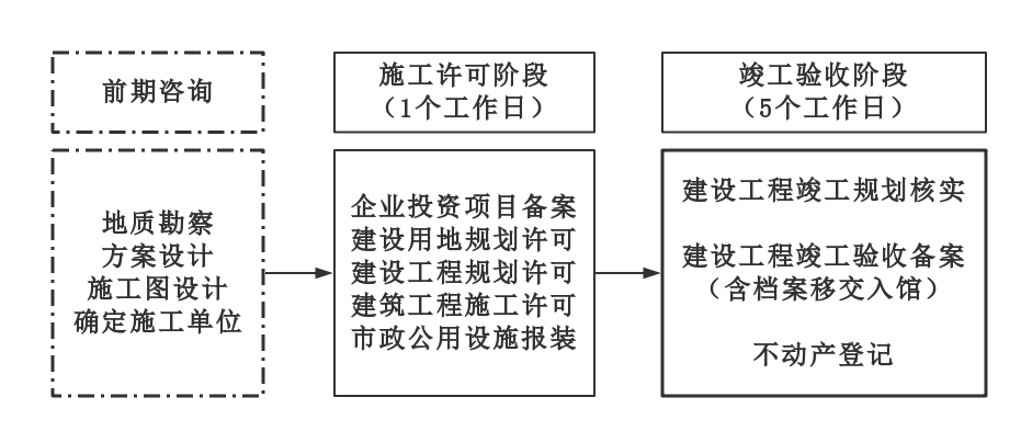 (一)再造审批流程。地质勘察、方案设计、施工图设计、市政公用服务外线工程实施等工作提前至签订土地合同前开展,做好施工前准备;将全流程简化为施工许可、竣工验收两个阶段,立项用地规划许可、工程建设许可阶段事项并入施工许可阶段办理,不动产登记并入竣工验收阶段办理。