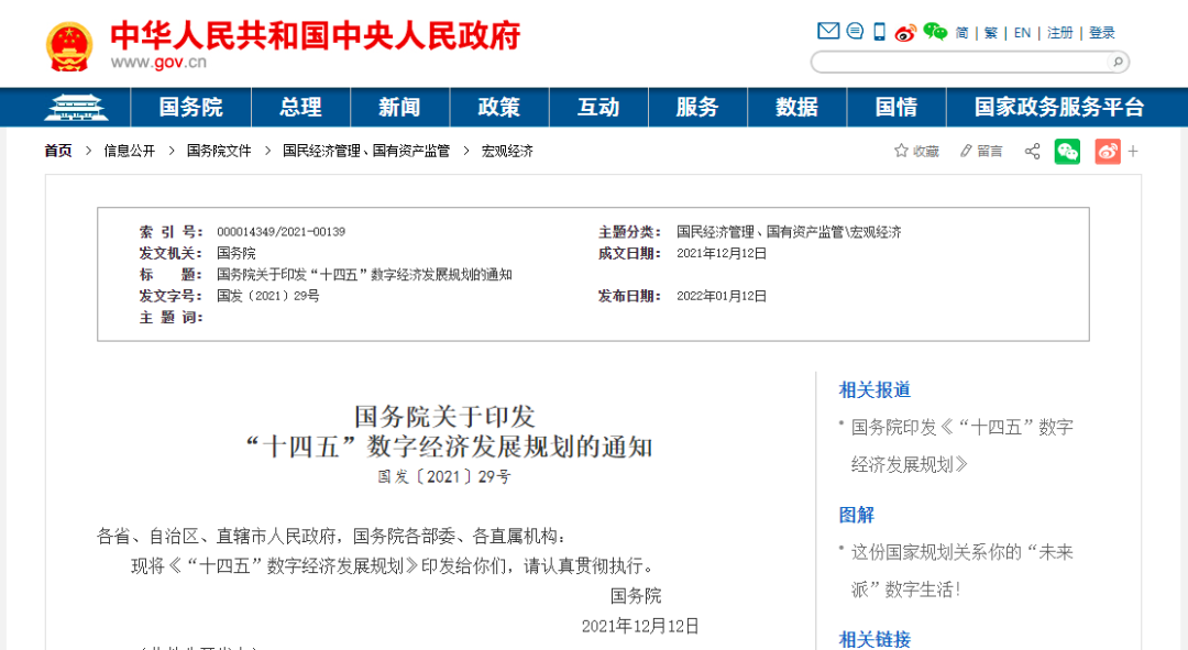 1月12日,中国政府网发布了《“十四五”数字经济发展规划》(以下简称《规划》)全文,明确了“十四五”时期推动数字经济健康发展的指导思想、基本原则、发展目标、重点任务和保障措施。