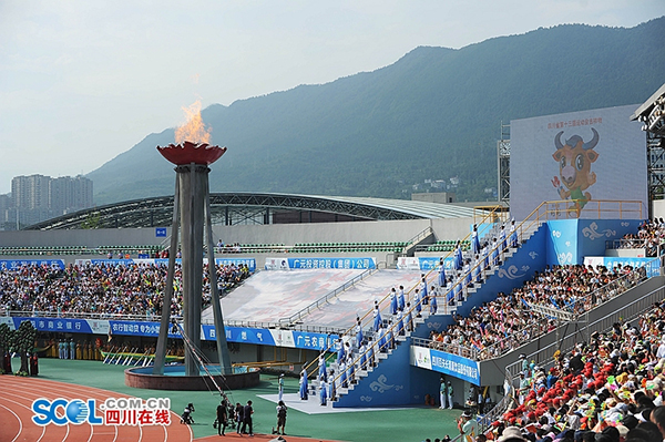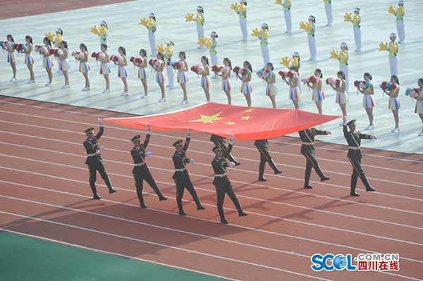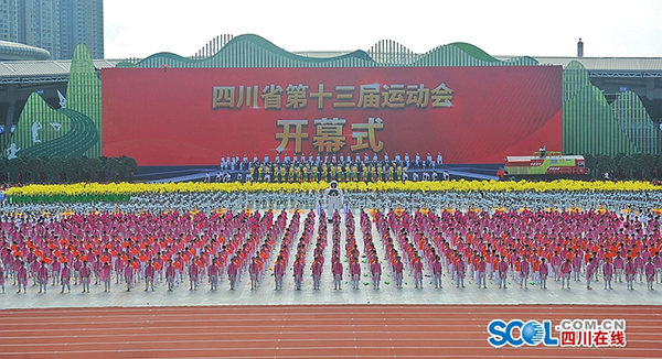 9时02分,彭清华宣布:四川省第十三届运动会开幕。澳源体育中心响起热烈掌声和欢呼声。伴随着本届运动会会歌嘹亮奏响,省运会会旗和本届运动会会旗缓缓升起。随后,运动员、裁判员、教练员代表分别郑重宣誓。点火仪式上,省运会火种先后经过多哈亚运会冠军林淼、全国脱贫攻坚奖奋进奖获得者李君、四川省道德模范赵海伶、中国跳水后起之秀洪云霞的传递,最终由一只神秘的凤凰从奥运冠军邹凯手中衔走火种并点燃了本届省运会的主火炬。