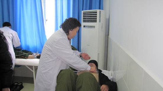 图为:民政优抚医院副主任医师为老人听诊