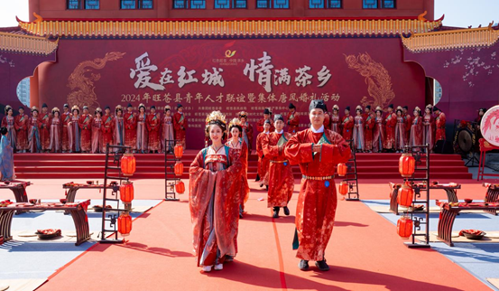 旺苍县民政局举办“爱在红城,情满茶乡”青年人才联谊暨集体唐风婚礼活动,20对新人身着华丽的唐风婚服,手挽手共同步入婚礼的殿堂。在庄严而神圣的仪式上,新人们共同签下了破陈规、除陋习、传文明、树新风的《移风易俗承诺书》和象征幸福与承诺的《幸福之约》,将争做文明婚俗的倡导者、践行者、推动者,做文明新人、建和谐家庭。
