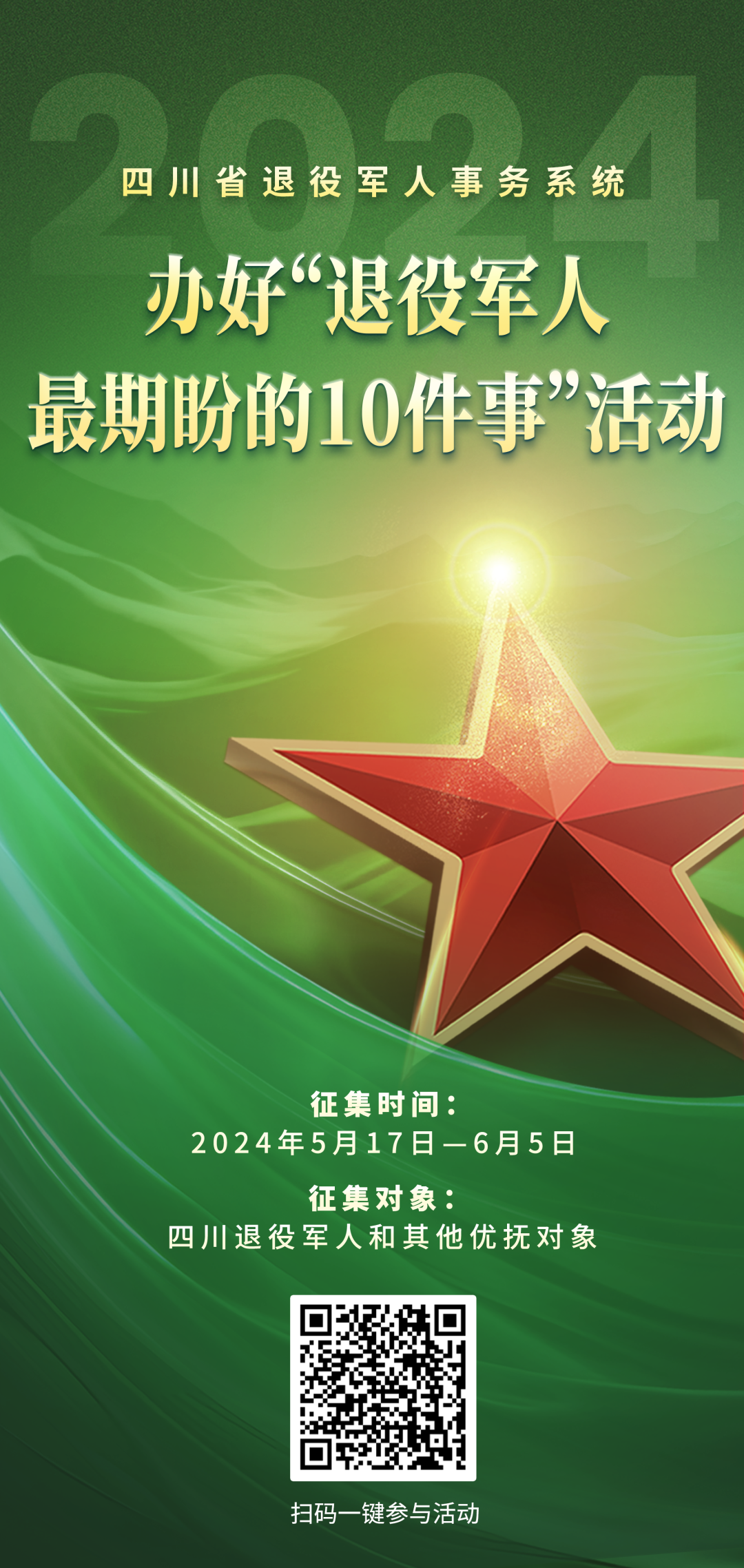您好!为进一步做好问需于民、精准服务,切实把服务保障退役军人的好事办好、实事办实,全省退役军人事务系统开展2024年度办好“退役军人最期盼的10件事”活动,现向您征集您最期盼解决的事项。感谢您的参与支持,祝您工作顺利、生活愉快。