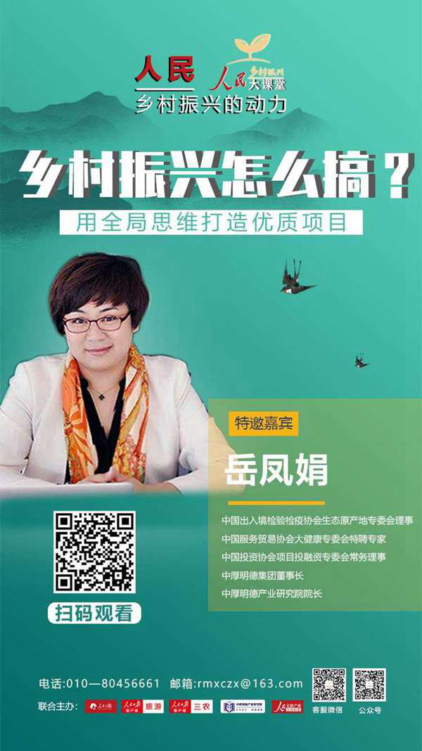 5月13日,人民日报社人民文旅联合人民日报客户端三农频道、旅游频道、人民文旅产业发展联盟与中厚明德产业研究院共同推出的“人民乡村振兴大课堂”正式上线。首期课堂,中国出入境检验检疫协会生态原产地专委会理事、中国服务贸易协会大健康专委会特聘专家、中国投资协会项目投融资专委会常务理事、山东省乡村振兴齐鲁样板研究院智库专家、中厚明德集团董事长、中厚明德产业研究院院长岳凤娟进行了主题为《乡村振兴怎么搞,用全局思维打造优质项目》的精彩分享。