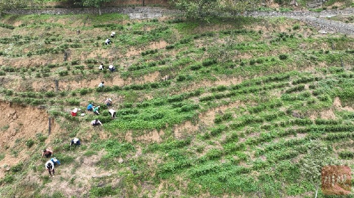 顺着坡上的梯田间小道,记者来到了声音的源头——一群正在挥舞着铁锹、镐头的庄稼汉。见到我们来,为首的中年汉子不好意思地笑了,“我是在给他们说整地的技术呢……”