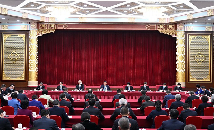 3月6日,中共中央总书记、国家主席、中央军委主席习近平看望参加全国政协十四届一次会议的民建、工商联界委员,并参加联组会,听取意见和建议。中共中央政治局常委、全国政协十四届一次会议主席团会议主持人王沪宁,中共中央政治局常委蔡奇、丁薛祥参加看望和讨论。新华社记者 申宏 摄
